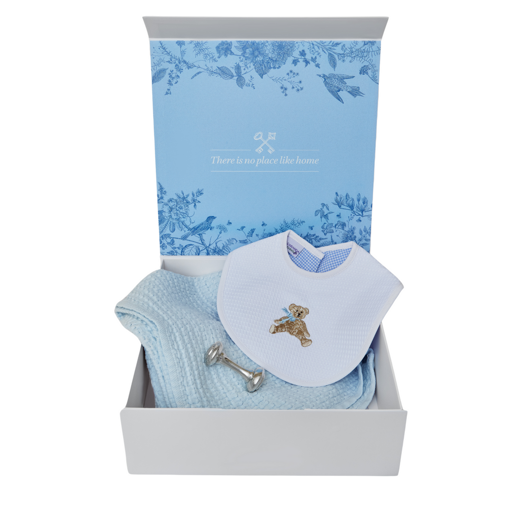 Elevate your baby's style with The Well Appointed House Baby Boy Gift Box. This exclusive set, curated exclusively by Melissa Hawks, includes a dumbbell pewter baby rattle, a bib bear in blue, and a luxurious stonewashed basket weave baby blanket in blue. It is perfect for gifting to parents who appreciate sophisticated and tasteful items for their little ones.