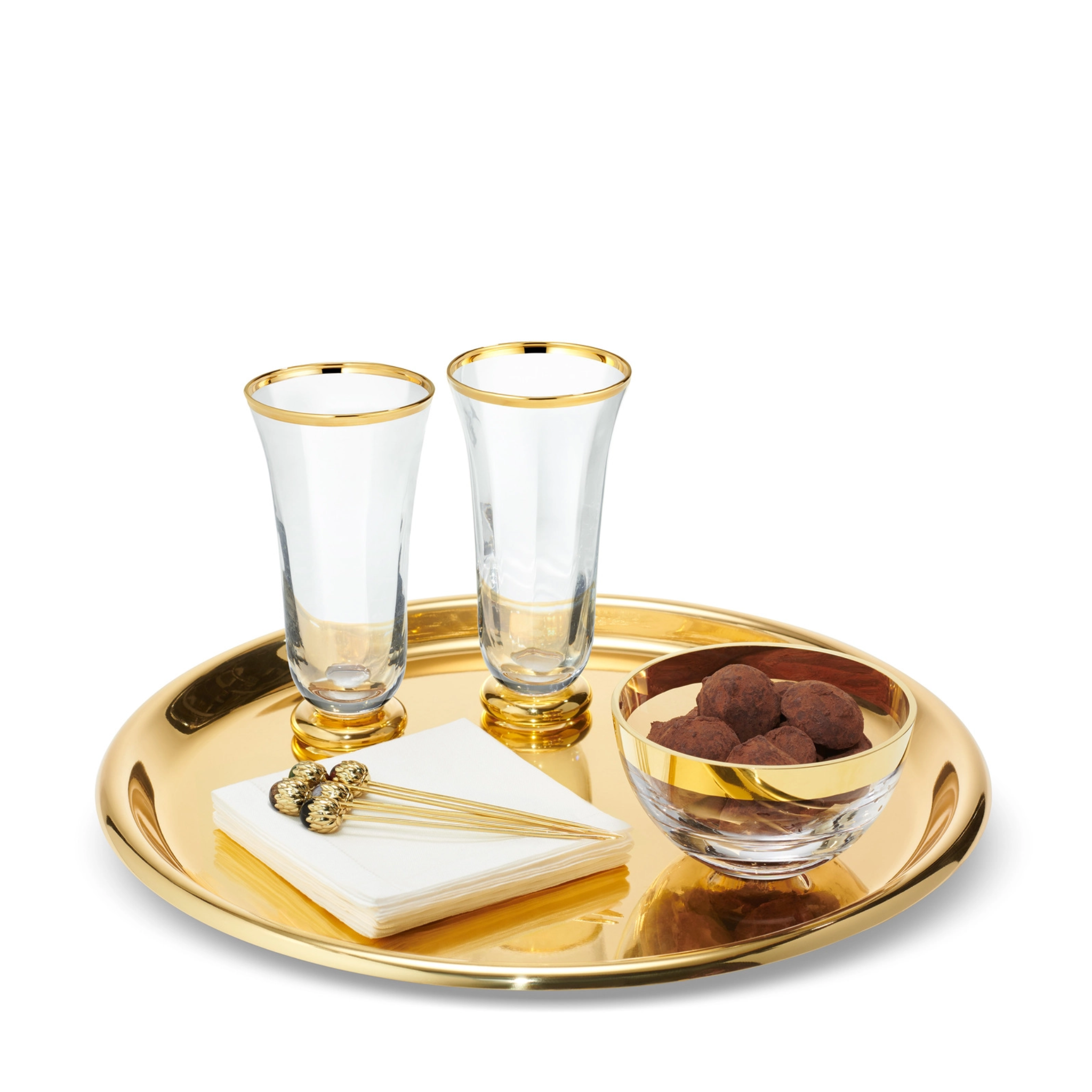 Embracing the streamlined elegance of the Art Deco era, this golden serving piece exudes both warmth and refined style. Its softly curved edge not only elevates its design but also delivers practical stability—perfect for presenting drinks at the bar or serving guests with flair.