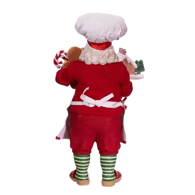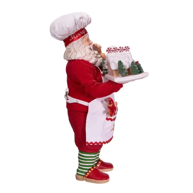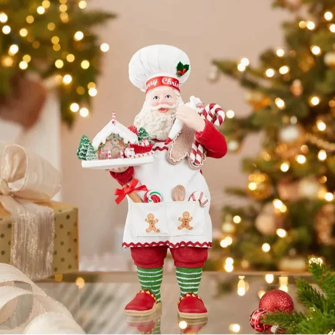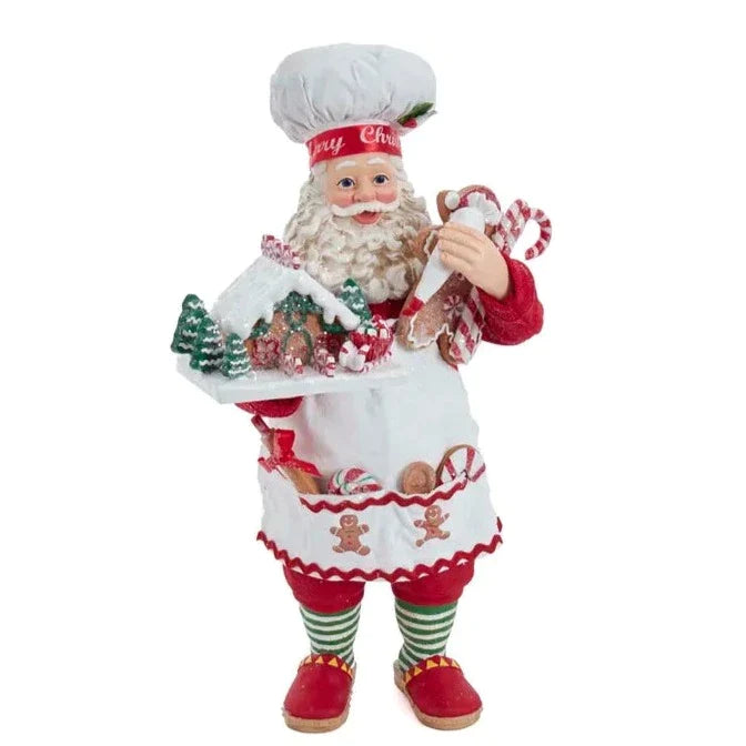 Celebrate the baker in your life with this Kurt Adler Fabriché™ Gingerbread Chef Santa! This 10.5" Santa features Santa wearing an apron decorated with gingerbread men and a chef's hat with a "Merry Christmas" ribbon border. Santa is carrying a decorated gingerbread house and candy canes.