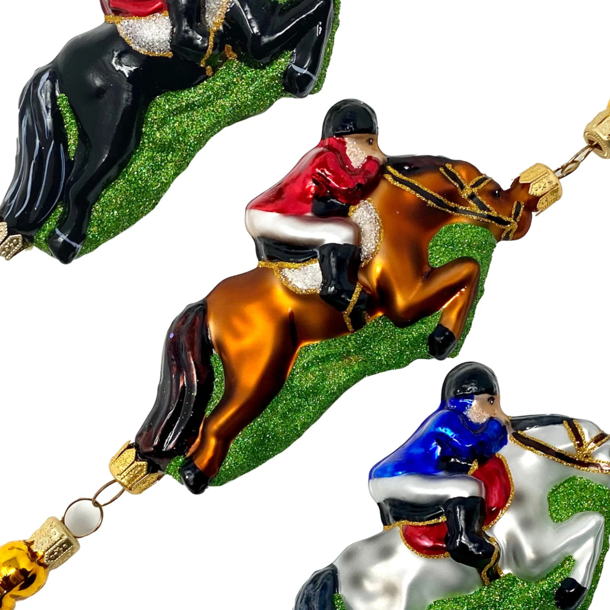 Gallop into the holiday spirit with the Derby Horse Glass Christmas Tree Garland - a festive tribute to equestrian elegance and racing tradition. This unique garland features a charming lineup of hand-painted glass horse heads, each inspired by the thrill and pageantry of derby day. Richly detailed with bridles, expressive features, and classic racing colors, the horses are strung together on a durable cord, ready to grace your tree, mantel, or banister. Perfect for horse lovers, racing fans, or anyone looking to add a touch of refined whimsy to their holiday décor.