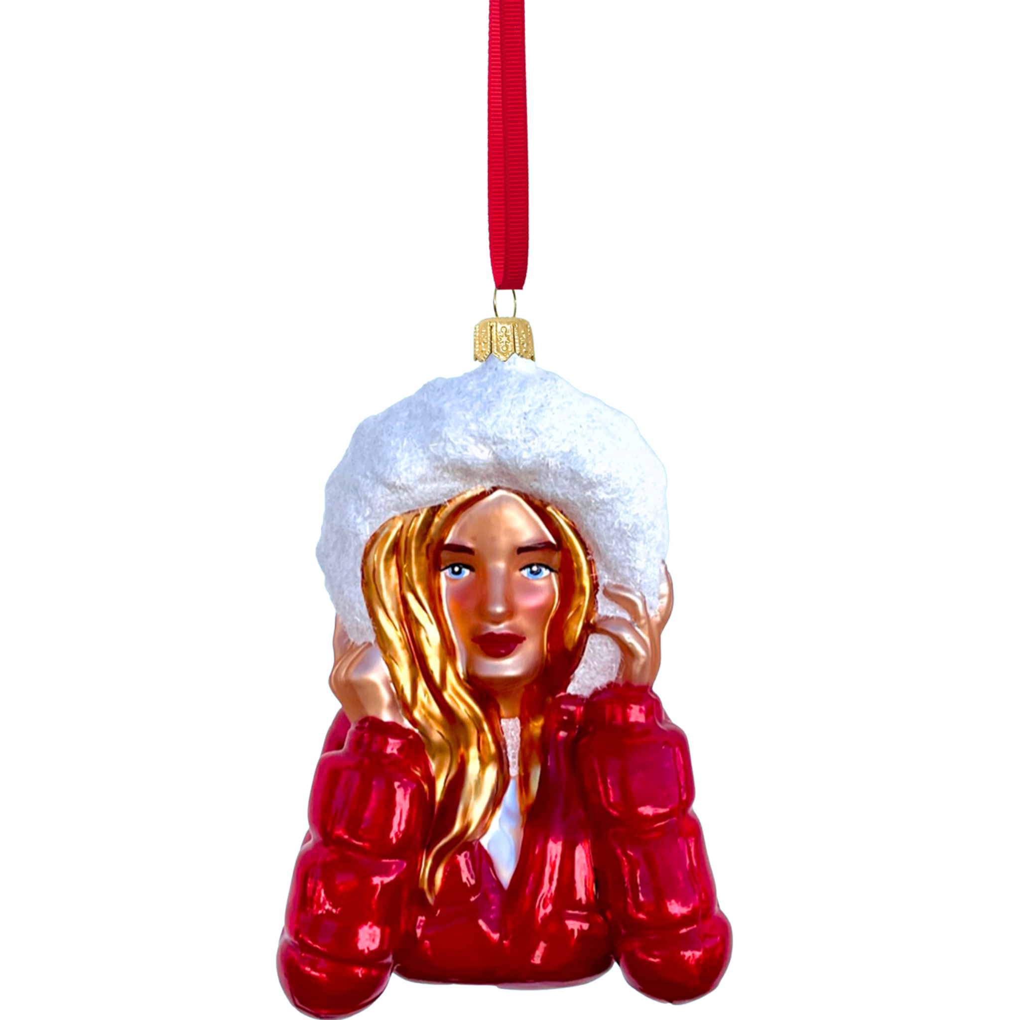 Meet Emily, your new festive friend dressed to warm your holiday heart. This delightful glass ornament features Emily bundled up in a vibrant crimson puffer jacket, topped with a plush white fur hat that adds a touch of winter whimsy. Hand-painted with loving detail, Emily’s rosy cheeks and cheerful expression bring a cozy, joyful spirit to your Christmas tree. Perfect for adding a pop of color and charm, she’s a festive companion that captures the magic of the season.