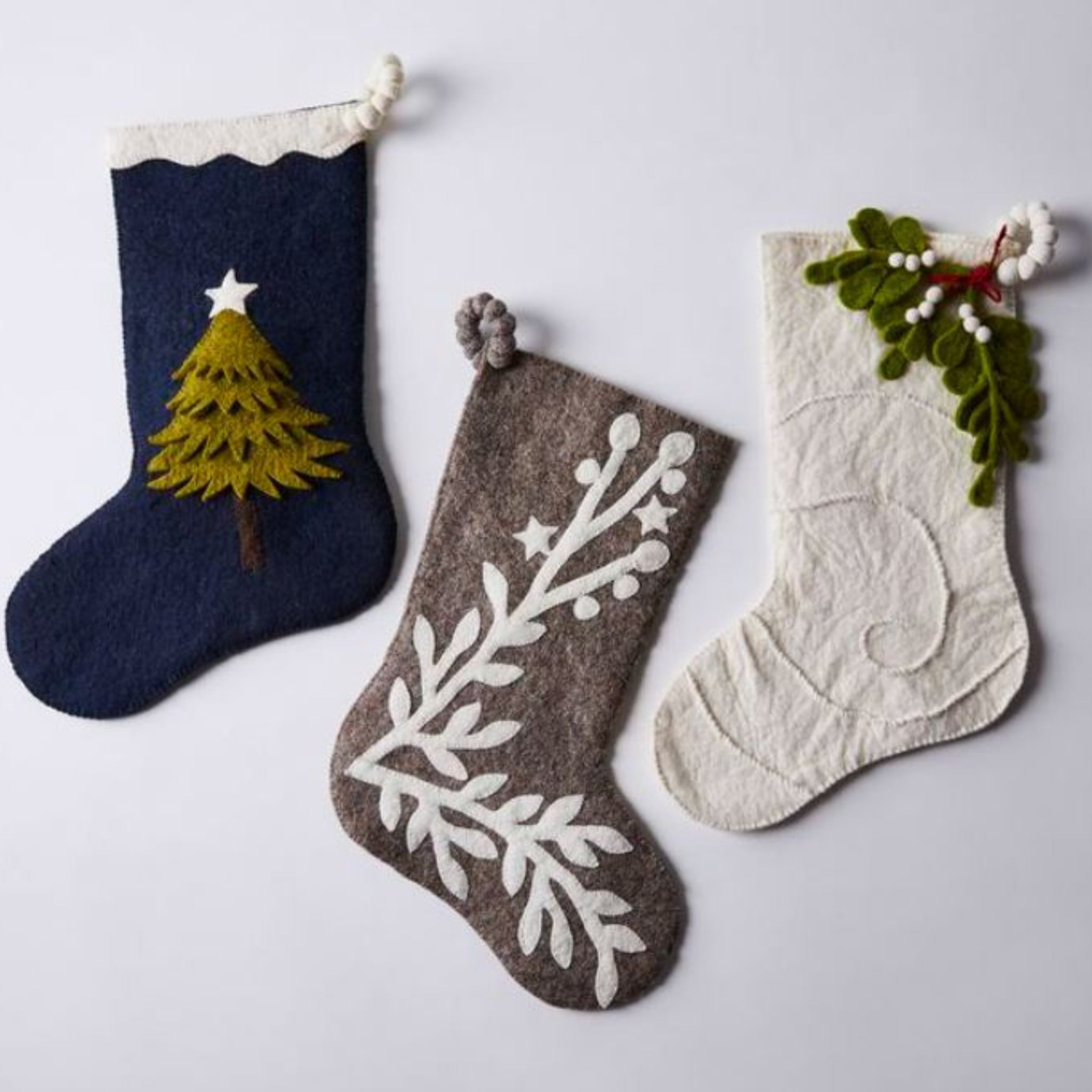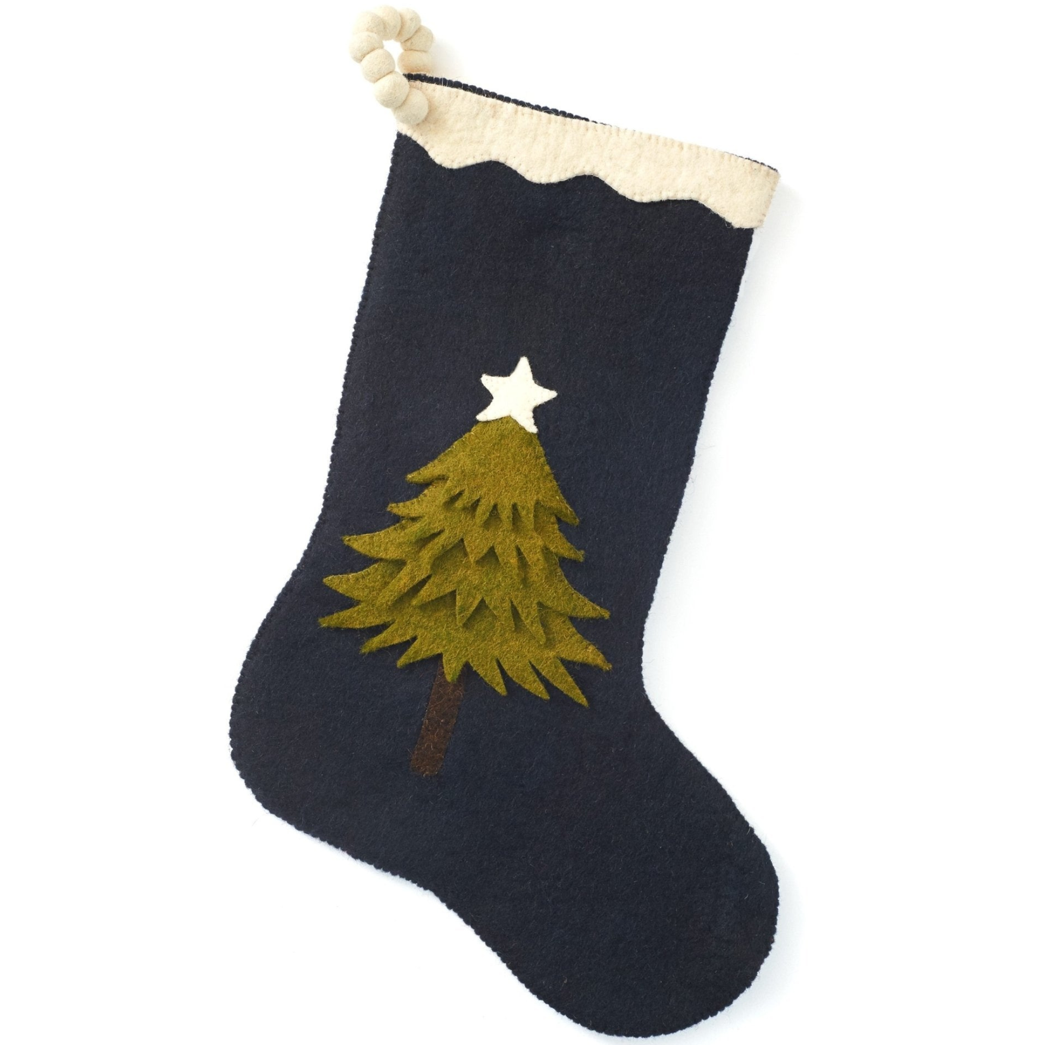 Hand Felted Wool Christmas Stocking - Tree on Navy Blue is a charming addition to your holiday decor. This evocative stocking celebrates the beauty of Christmas trees in their natural state, adorned only with a simple star on top. The design is featured on both sides, making it a delightful piece from any angle. Each stocking is handmade by skilled artisans in India, ensuring that every piece is unique. Crafted from 100% sustainable wool, these stockings are not only beautiful but also eco-friendly.