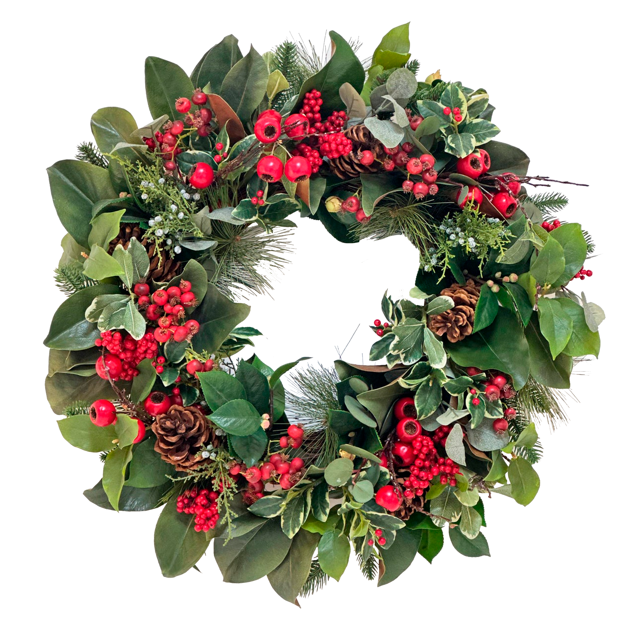 The Holiday Deluxe Wreath 26″ showcases a lush mix of lifelike greenery, festive accents, and vibrant details in a full 26-inch design. Perfect for doors, mantels, or walls, it adds rich texture and holiday charm. Maintenance-free and durable, this wreath brings timeless elegance and lasting seasonal beauty to any décor.