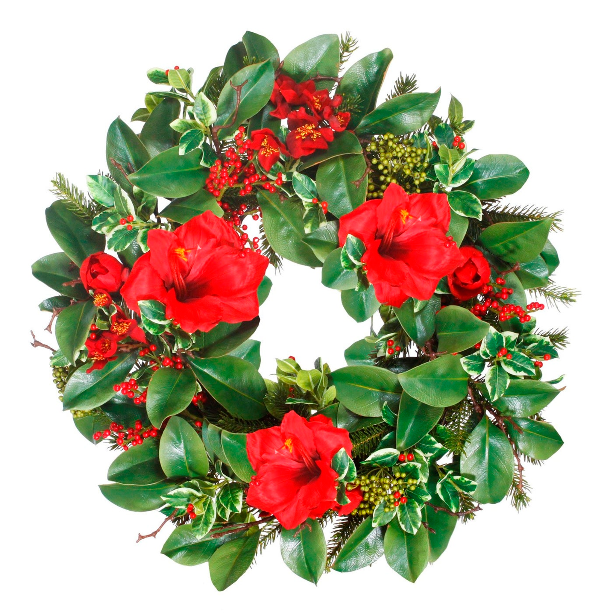 The Holiday Garden Amaryllis Wreath 24″ features vibrant, lifelike amaryllis blooms accented with festive greenery in a classic 24-inch design. Perfect for doors, walls, or mantels, it brings rich color and seasonal charm. Maintenance-free and durable, this wreath adds timeless holiday elegance and lasting beauty to any décor.