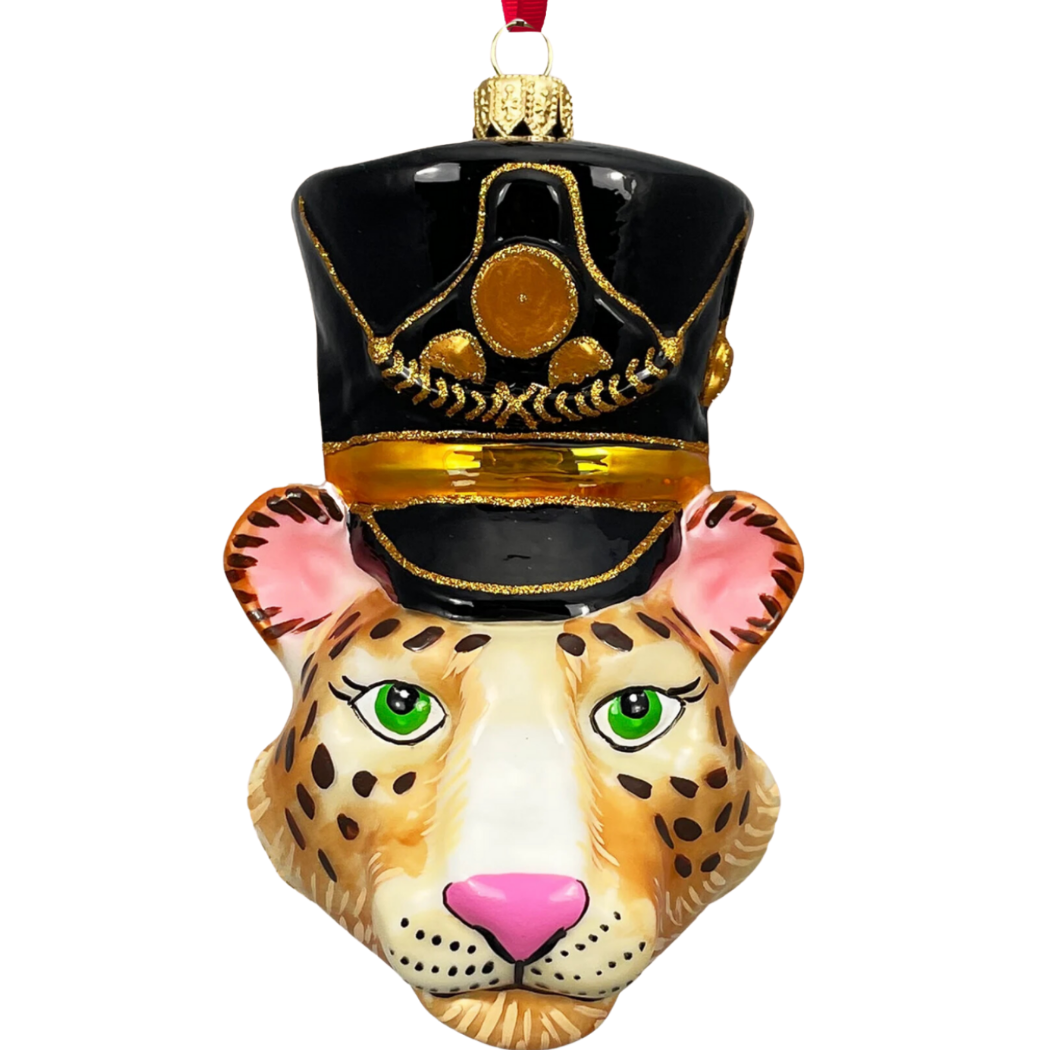 Add a bold, exotic flair to your holiday décor with this striking ornament. Meticulously crafted from glass, the ornament showcases a fierce yet elegant leopard face, complete with vivid green eyes that sparkle with lifelike intensity. Atop its head sits a stylish black hat with gold accents, blending classic holiday charm with a wild twist.