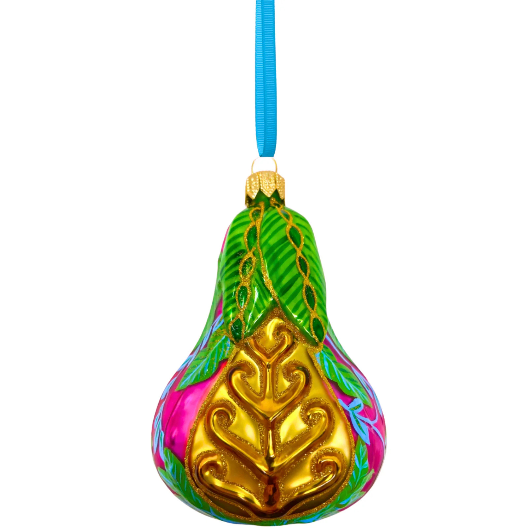 This exquisite pear glass ornament is a true work of art, designed to bring a touch of elegance and vibrancy to your holiday décor. Lush emerald green leaves delicately wrap around a radiant golden pear, creating a stunning contrast that exudes richness and depth. The pear itself is beautifully kissed with shimmering fuchsia and sapphire hues, adding a pop of color and an enchanting, jewel-like glow. Whether adorning your tree or displayed as a statement piece, this ornament will surely capture the light and captivate hearts.