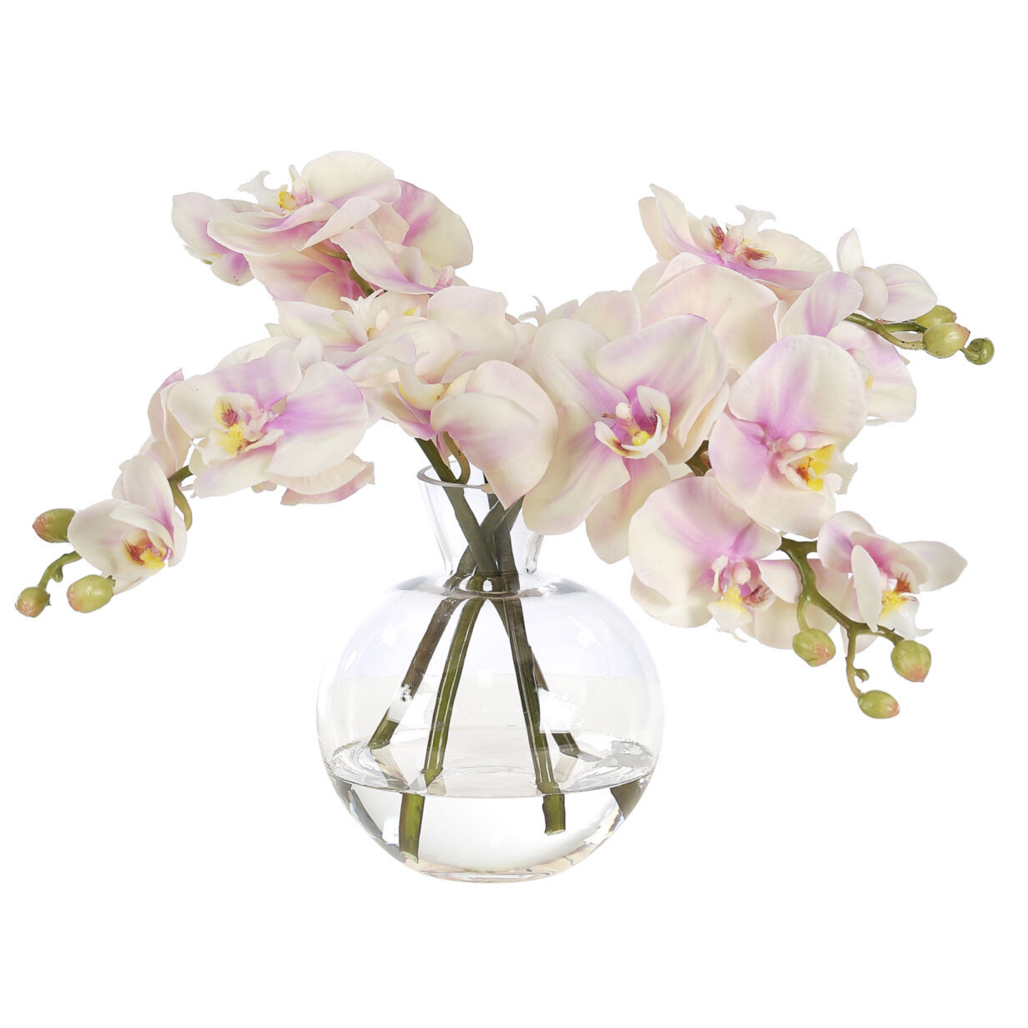 This beautiful faux pink and cream Orchid Phalaenopsis arrangement features multiple stems of beautiful flowers in a watergarden vase.