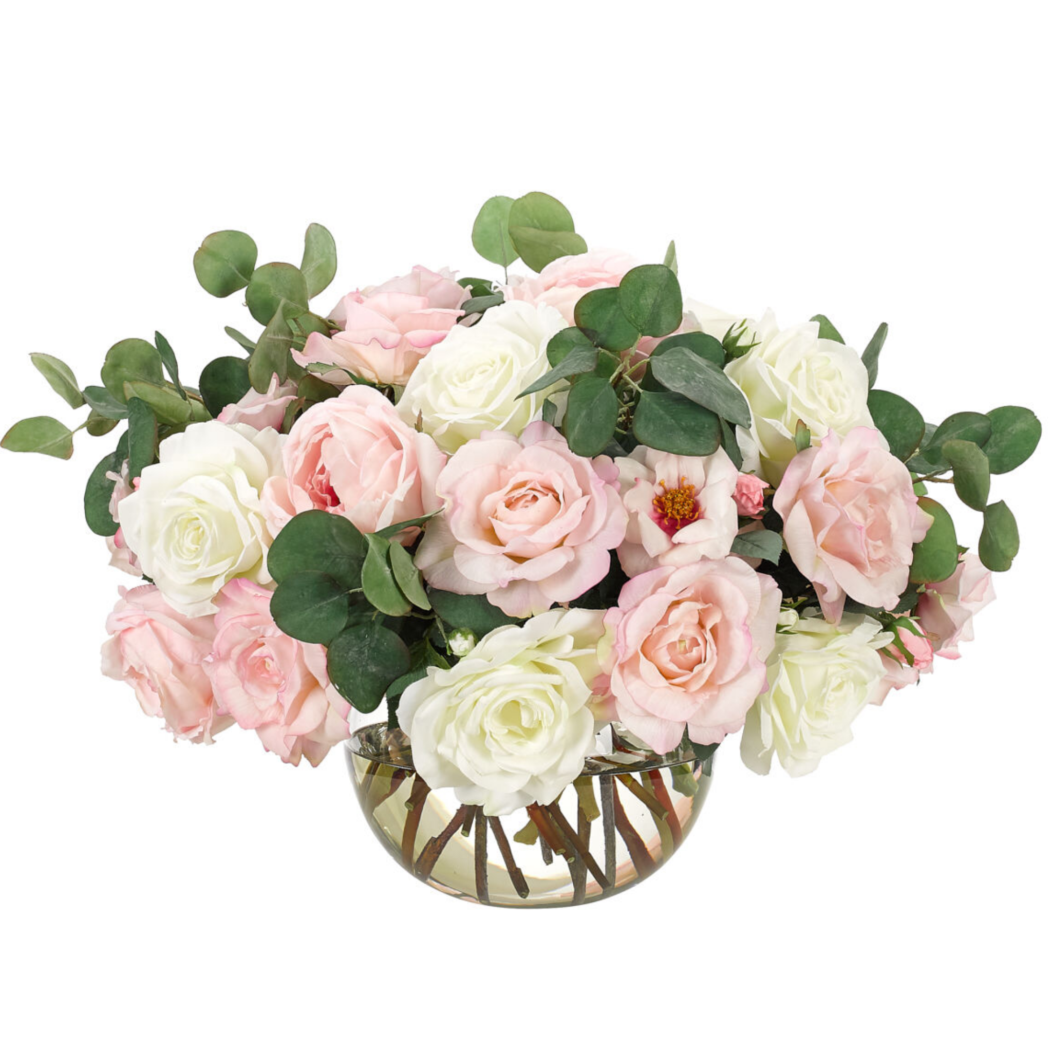 This beautiful faux pink and white rose arrangement features an abundance of beautiful flowers in a watergarden vase.
