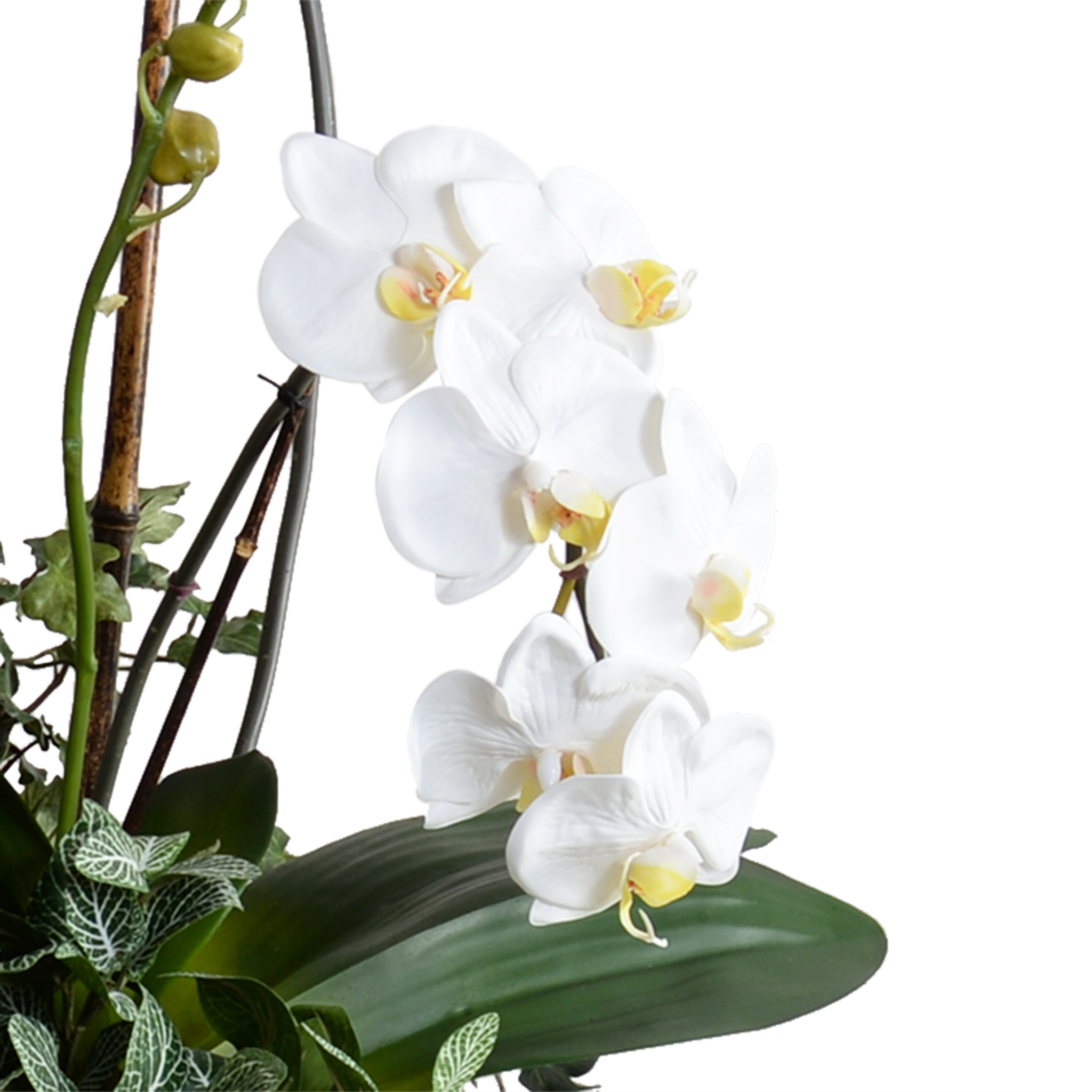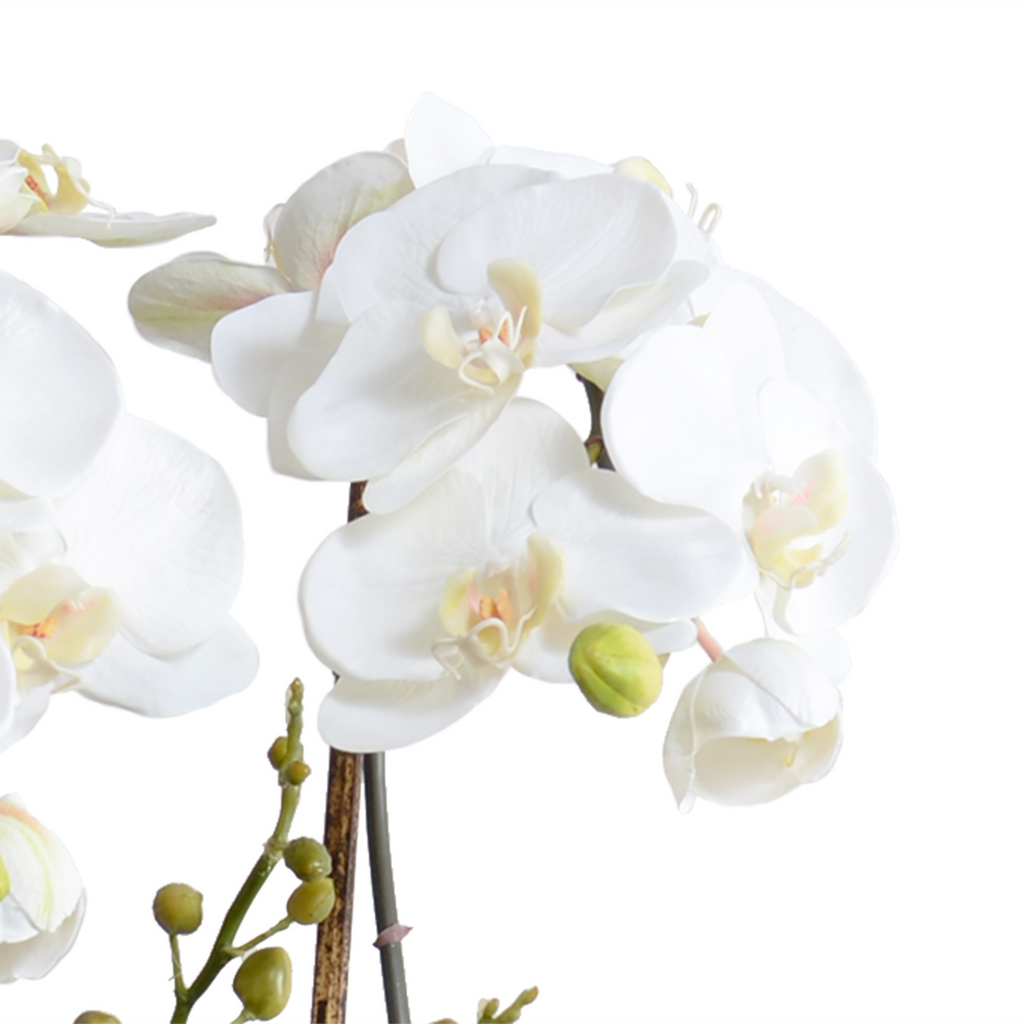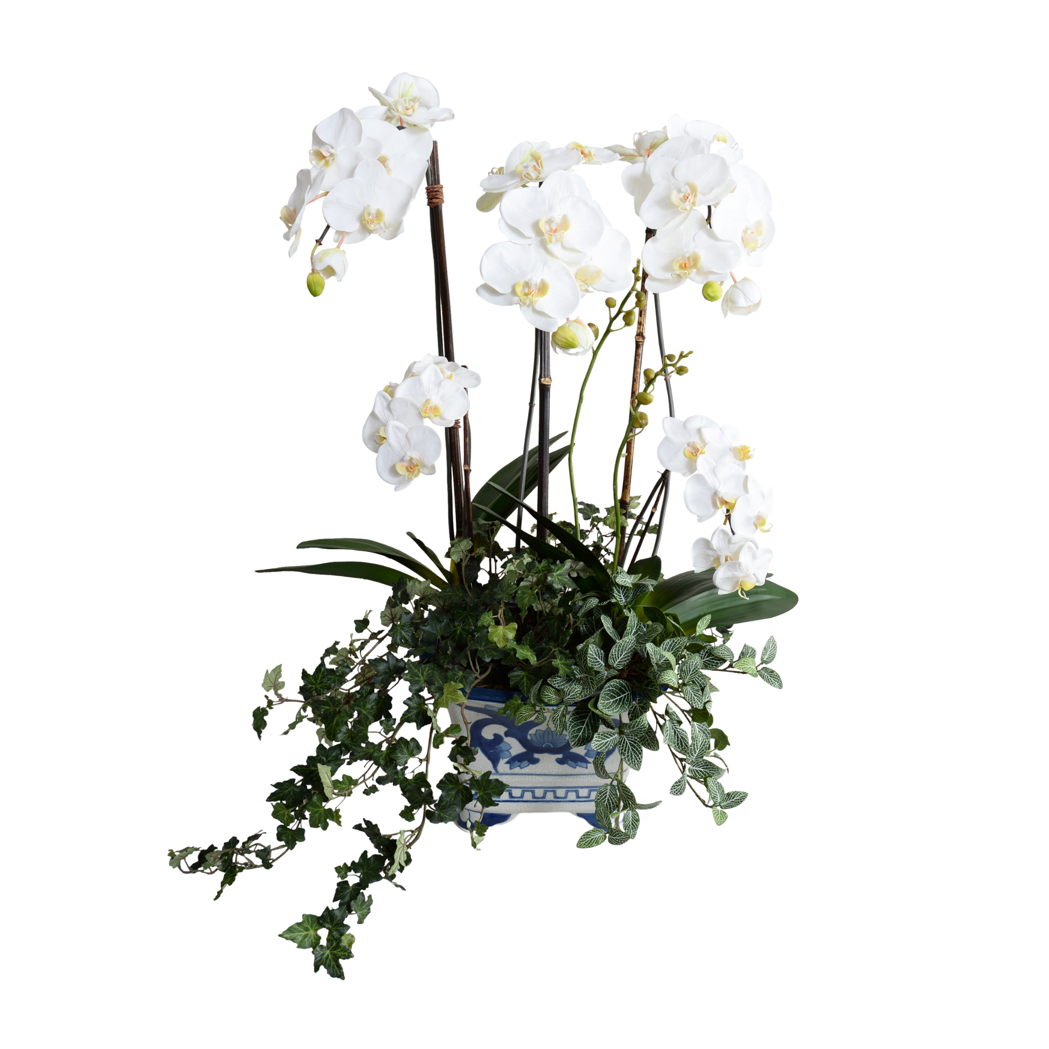 A beautiful centerpiece orchid plant with five premium lifelike Phalaenopsis stems filled with white or fuchsia blooms, a couple small bud stems, and trailing vines at the base. The orchids are carefully planted by hand in this ornate blue and white footed vase with traditional pattern. The blooming faux stems are attached to natural black bamboo, with realistic pre-shaped leaves at the base of each stem, and finished with our artificial potting soil. Intended for Indoor Use.