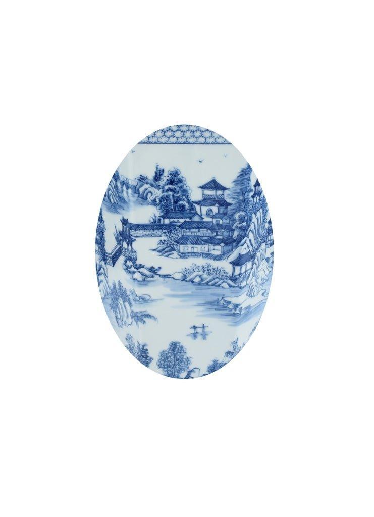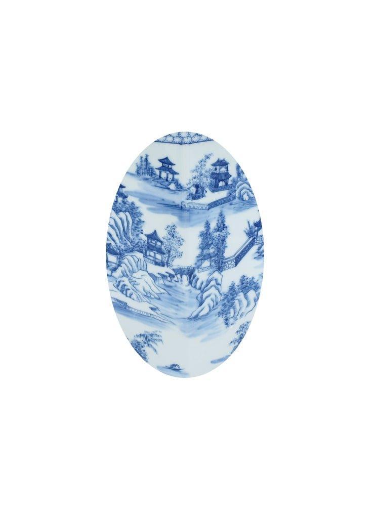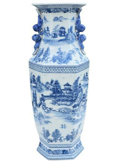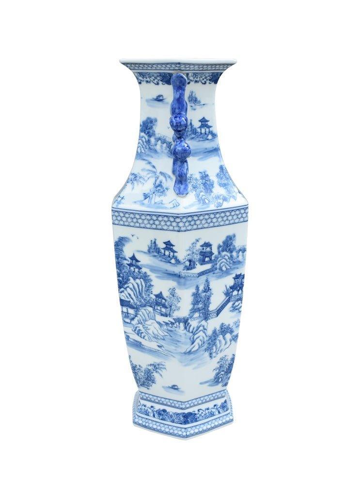 This lovely porcelain hexagonal vase features a blue and white chinoiserie pattern. The vase measures 24"H. Shade and color variations are intrinsic to the beauty of handmade items and are not a product defect. Each product is unique, and the product photo shown represents one, but colors can vary.