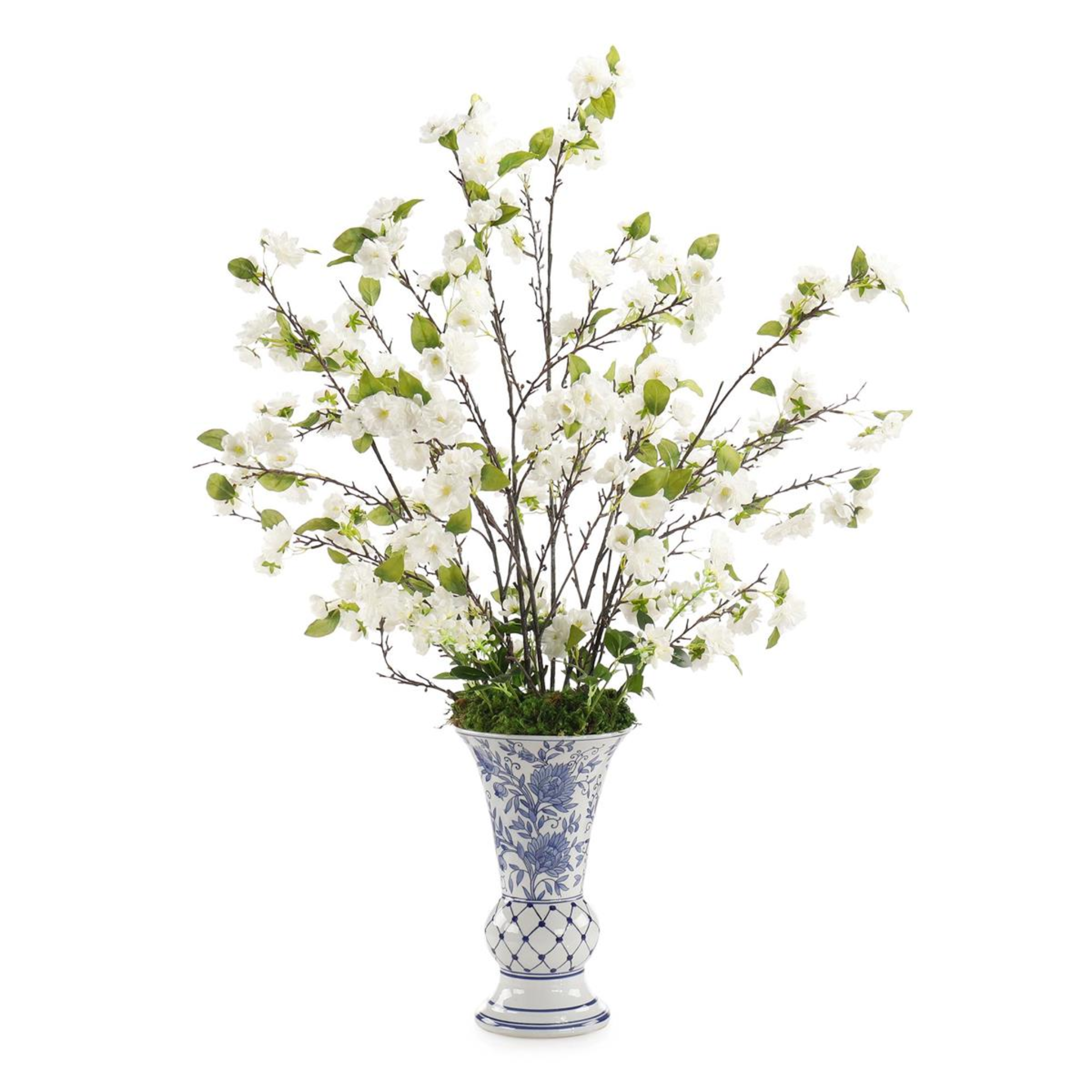 Blue Chinoiserie Cherries displays a stunning chinoiserie vase containing white cherry blossoms, complete with green mood moss.