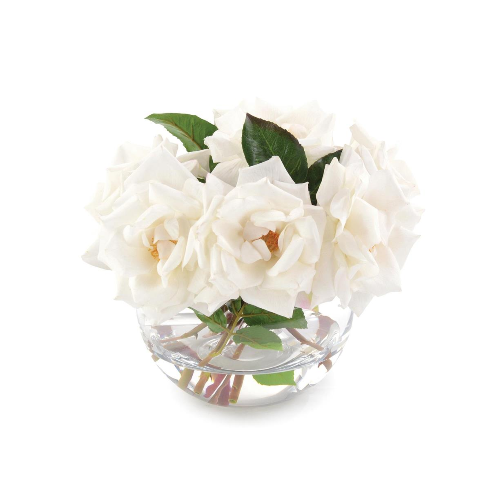 Open, real-touch roses that feel garden fresh are in a crystal rose bowl and faux water.