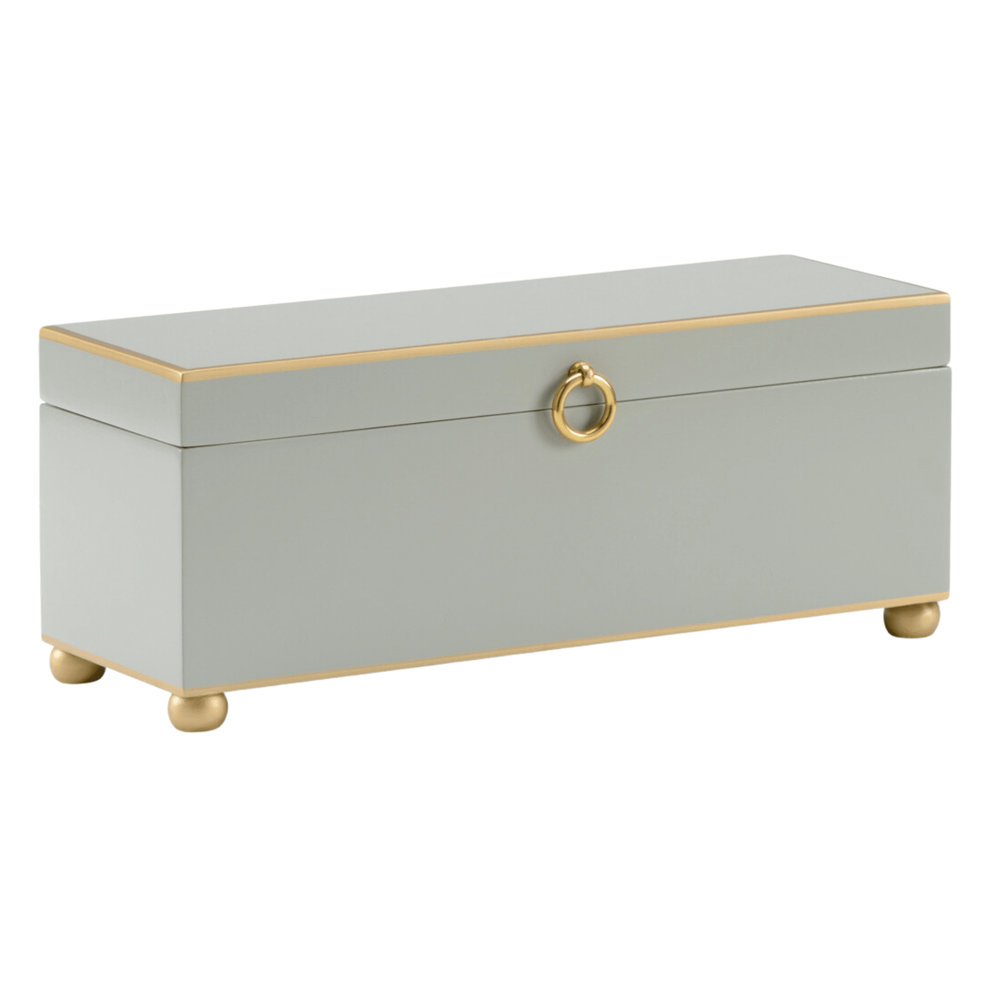 This lovely storage box is a pretty and practical piece. Place on any vanity, night stand, dresser, or coffee table for style that serves a purpose! This wooden box is hand painted in gray with gold accents and measures 5.8"h x 14"w x 5.5"d. It features polished brass hardware. It is perfect for delicate items with felt lined interior! This box comes in more color options, see related items. Click on images for greater detail.
