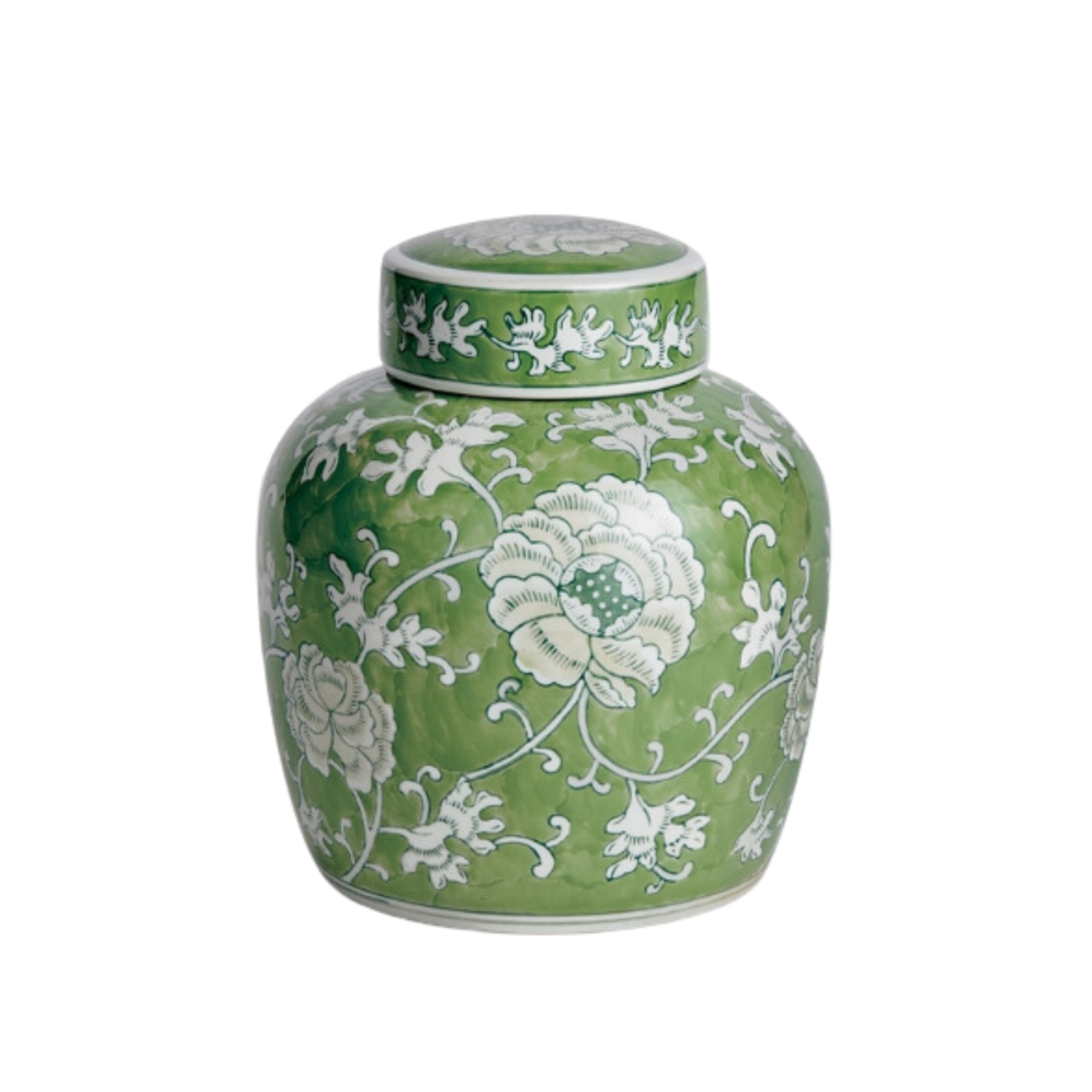 A classic chinoiserie lidded jar in shades of green. A welcome addition, to your bookshelf, mantel or entry table. Handcrafted - each piece is an original and varies in size and color. Click images for greater detail.