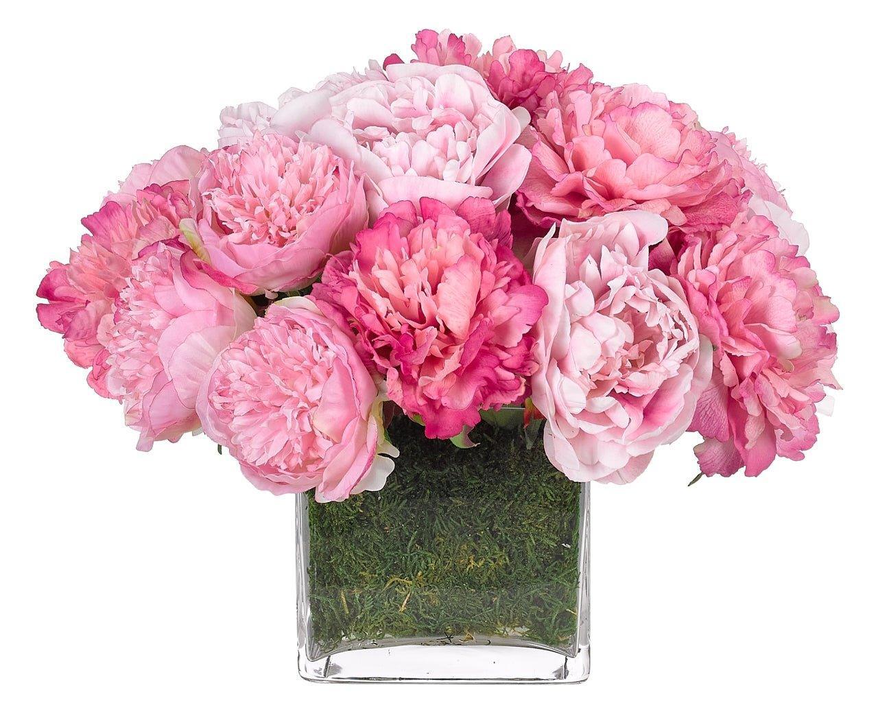 This elegant faux arrangement features pink peonies in a glass cube filled with a color-contrasting moss garden.