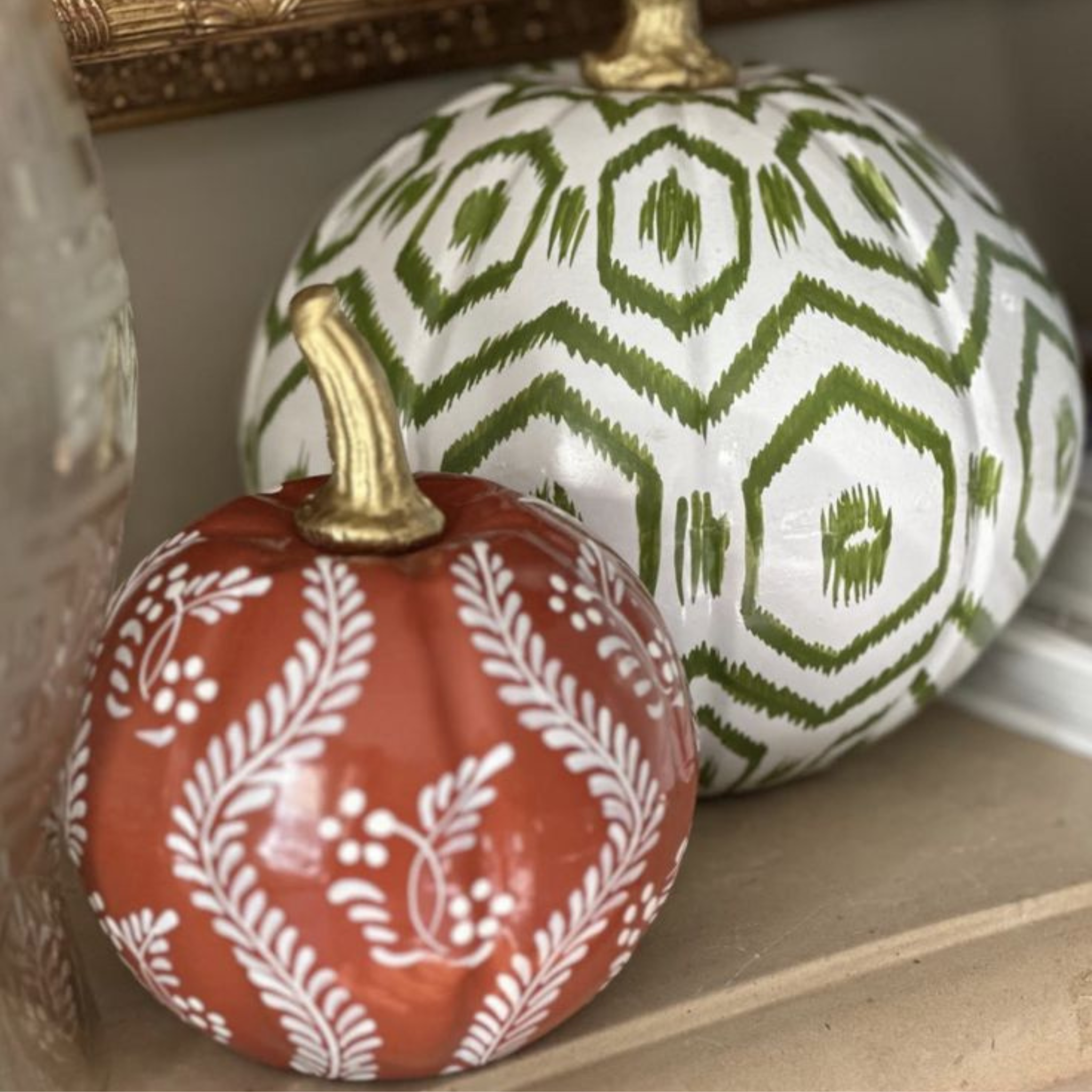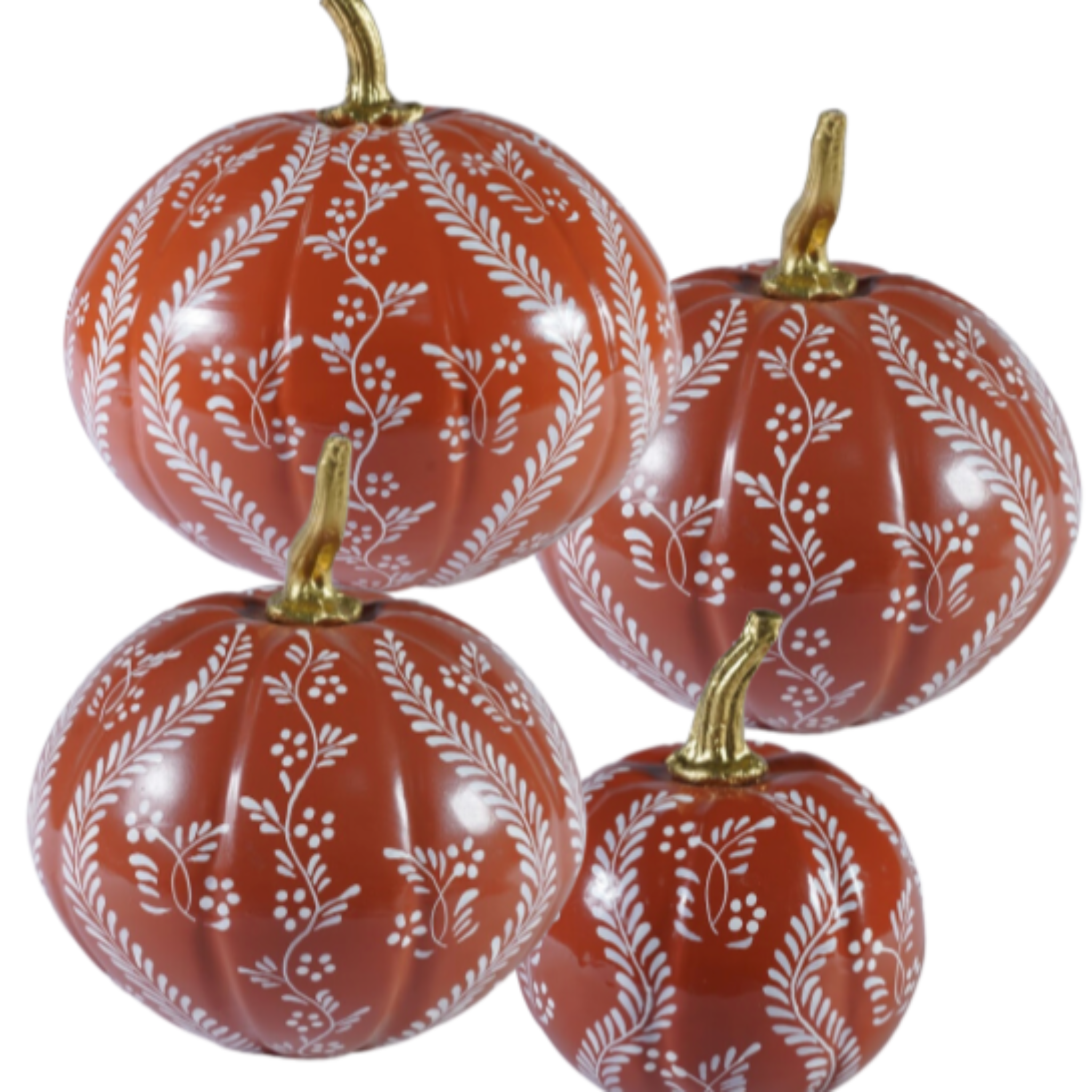Add a touch of rustic elegance to your seasonal décor with this decorative pumpkin, featuring a delicate white floral and vine design. The rich, weathered red finish evokes warm autumn vibes, while the intricate white floral and vine patterns provide a beautifully detailed contrast that highlights the artisan craftsmanship. Durable and charming, this metal pumpkin is perfect for adding texture and character to mantels, tabletops, or porch displays. Its handcrafted quality ensures each piece is unique, making it a standout accent for farmhouse, rustic, or vintage-inspired fall décor.