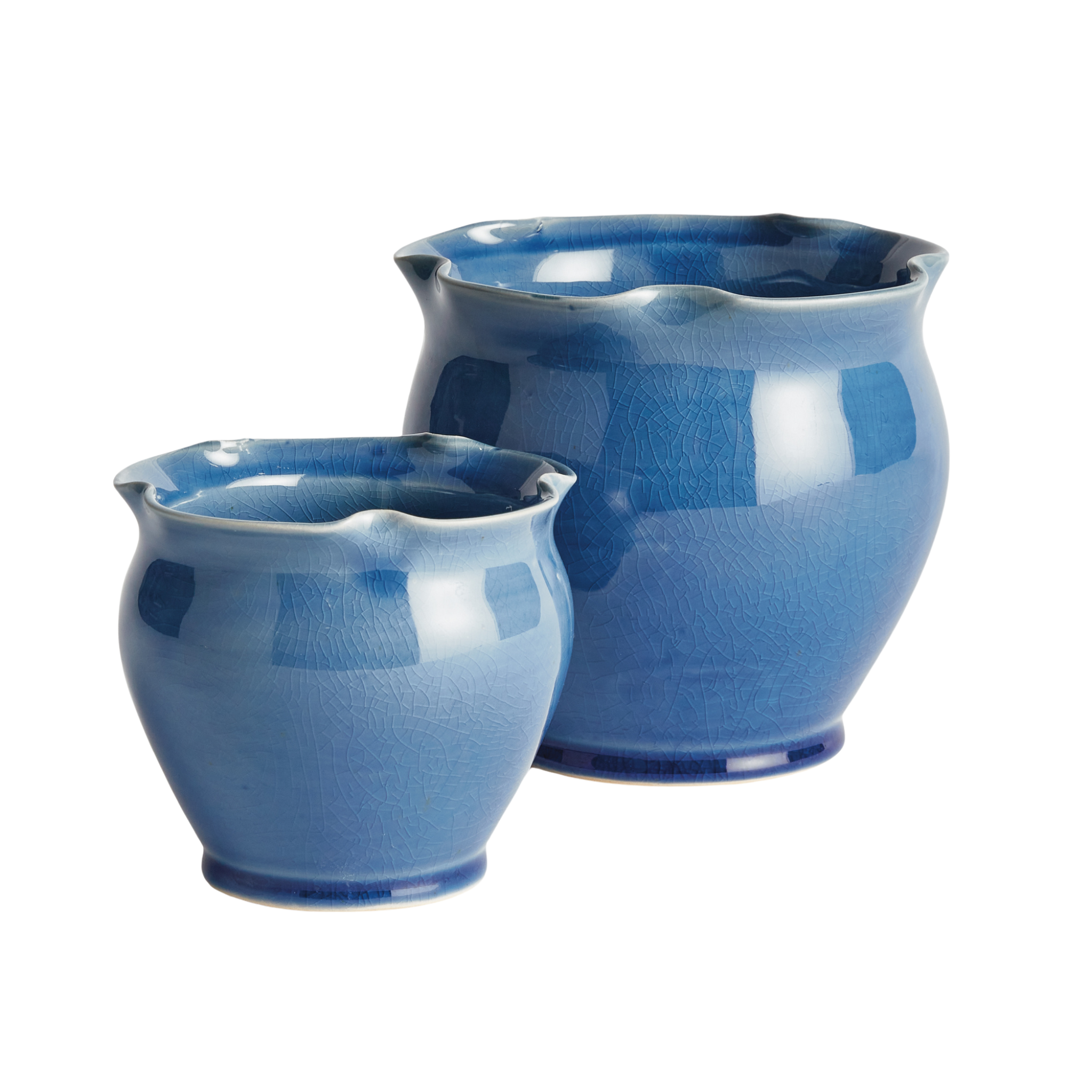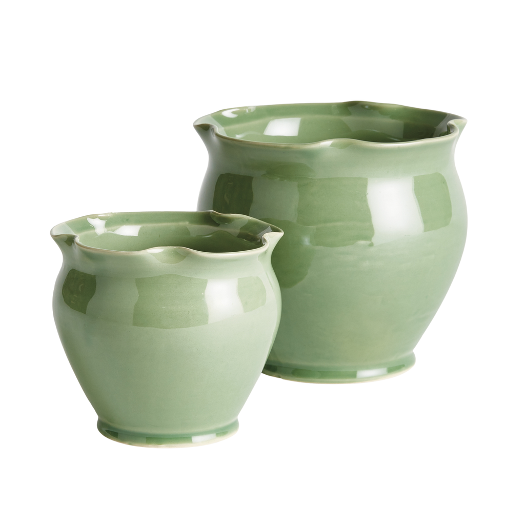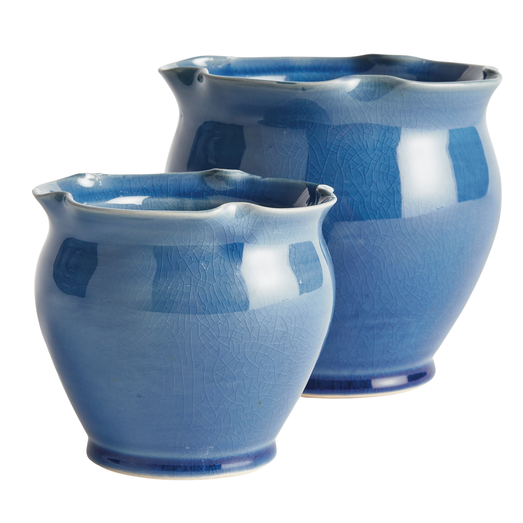 What makes these pots unique is the deep blue or green glaze. The ruffle rim detail at the top adds a feminine touch. The perfect pair for your favorite flowers or herbs.