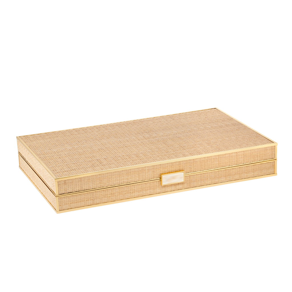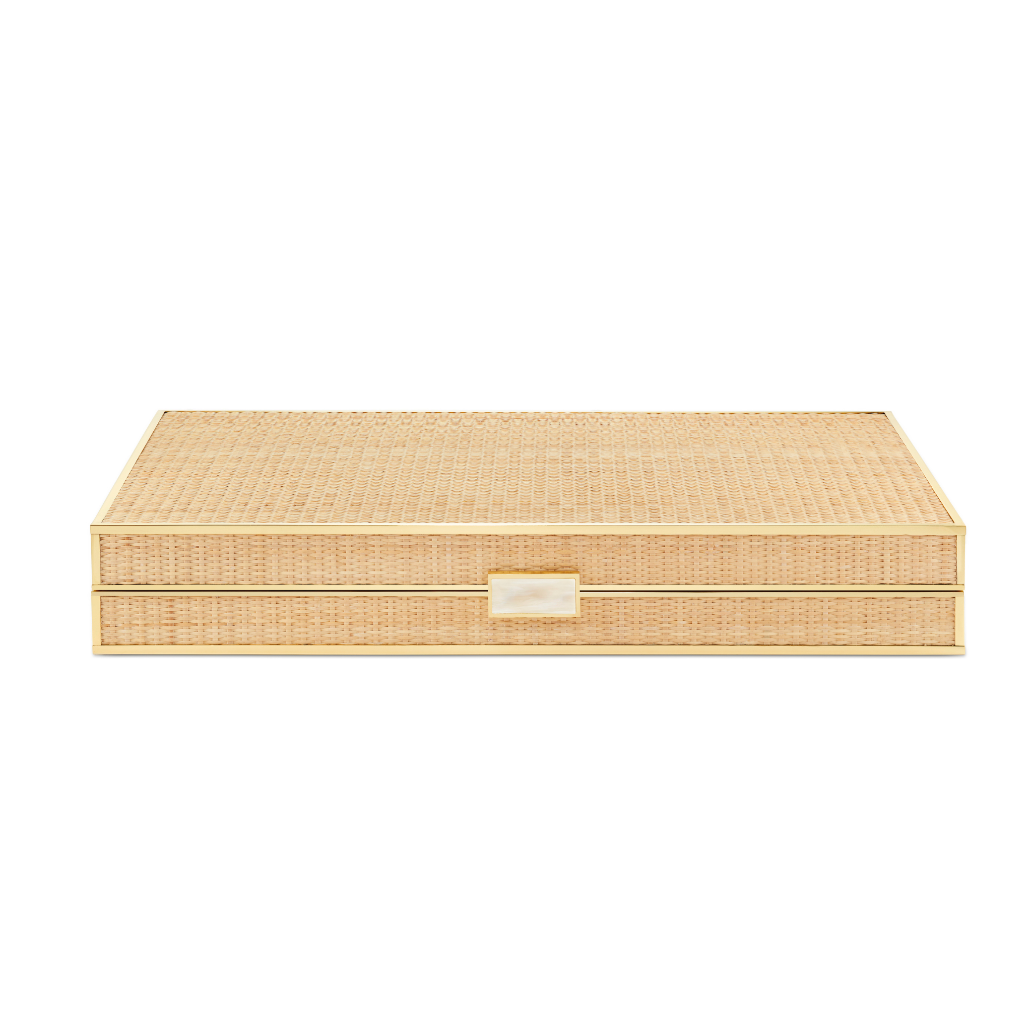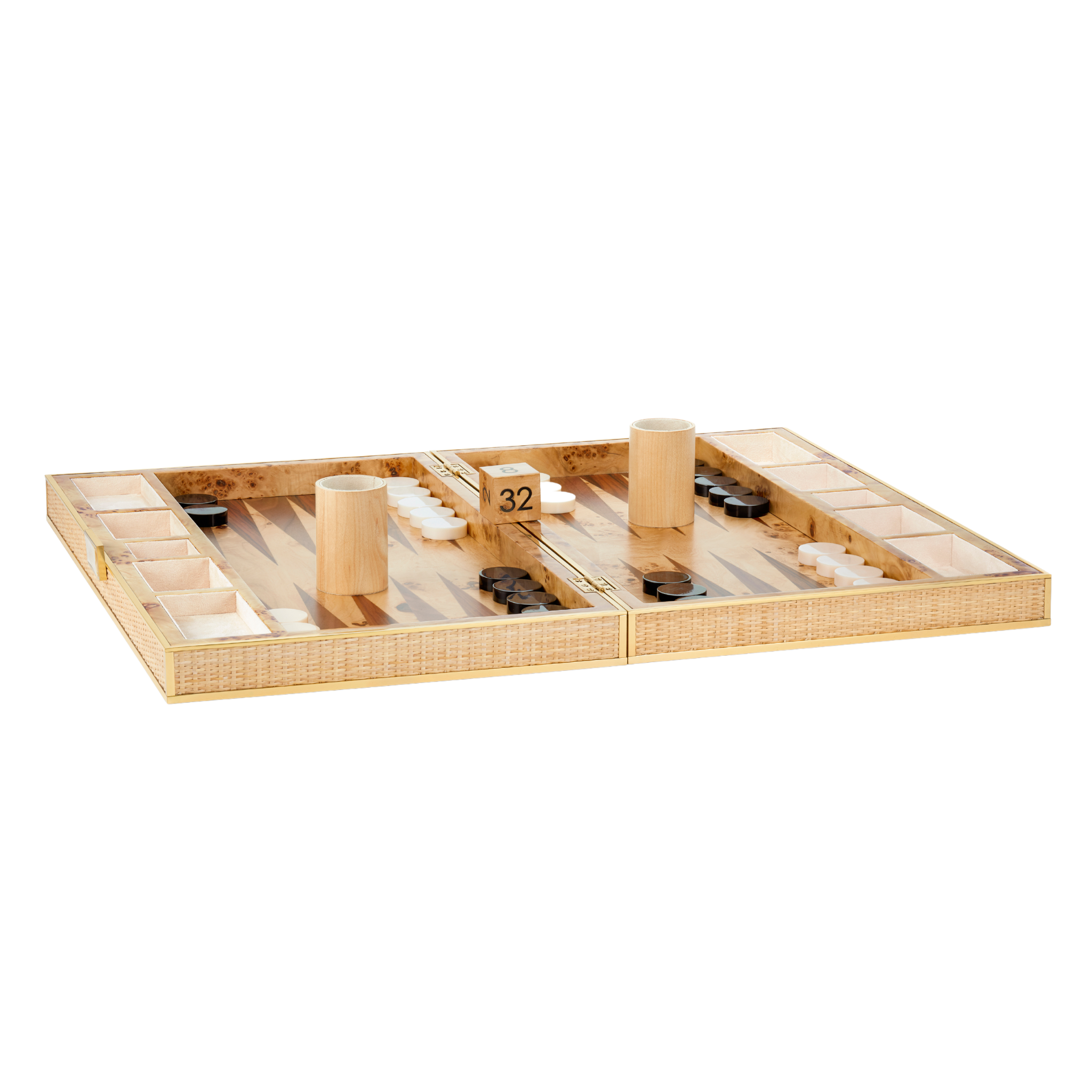 This backgammon set, one of the oldest board games for two, is beautifully presented with a burlwood and suede interior. The case is crafted from woven cane edged in brass, inspired by bamboo and raffia designs from the 1970s.
