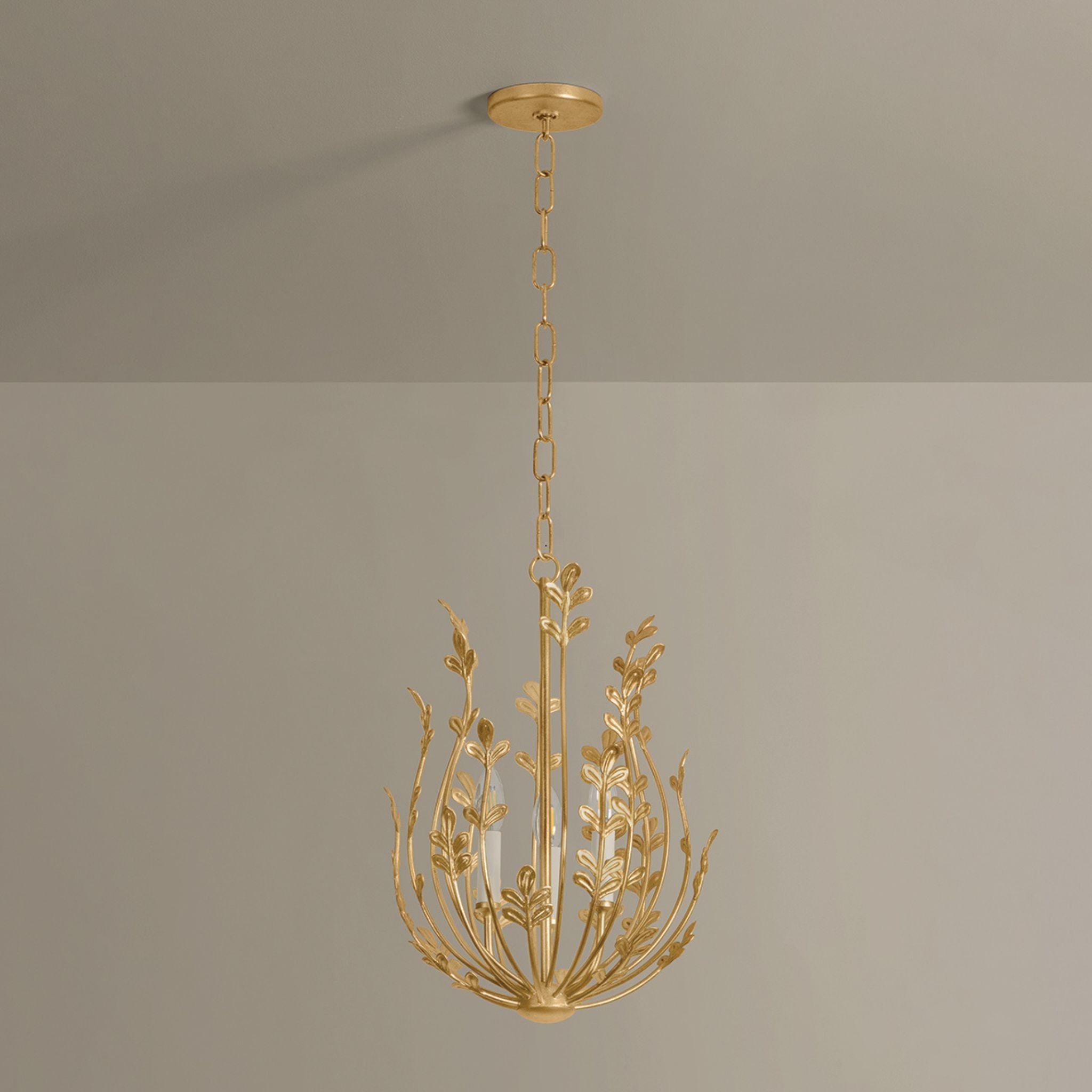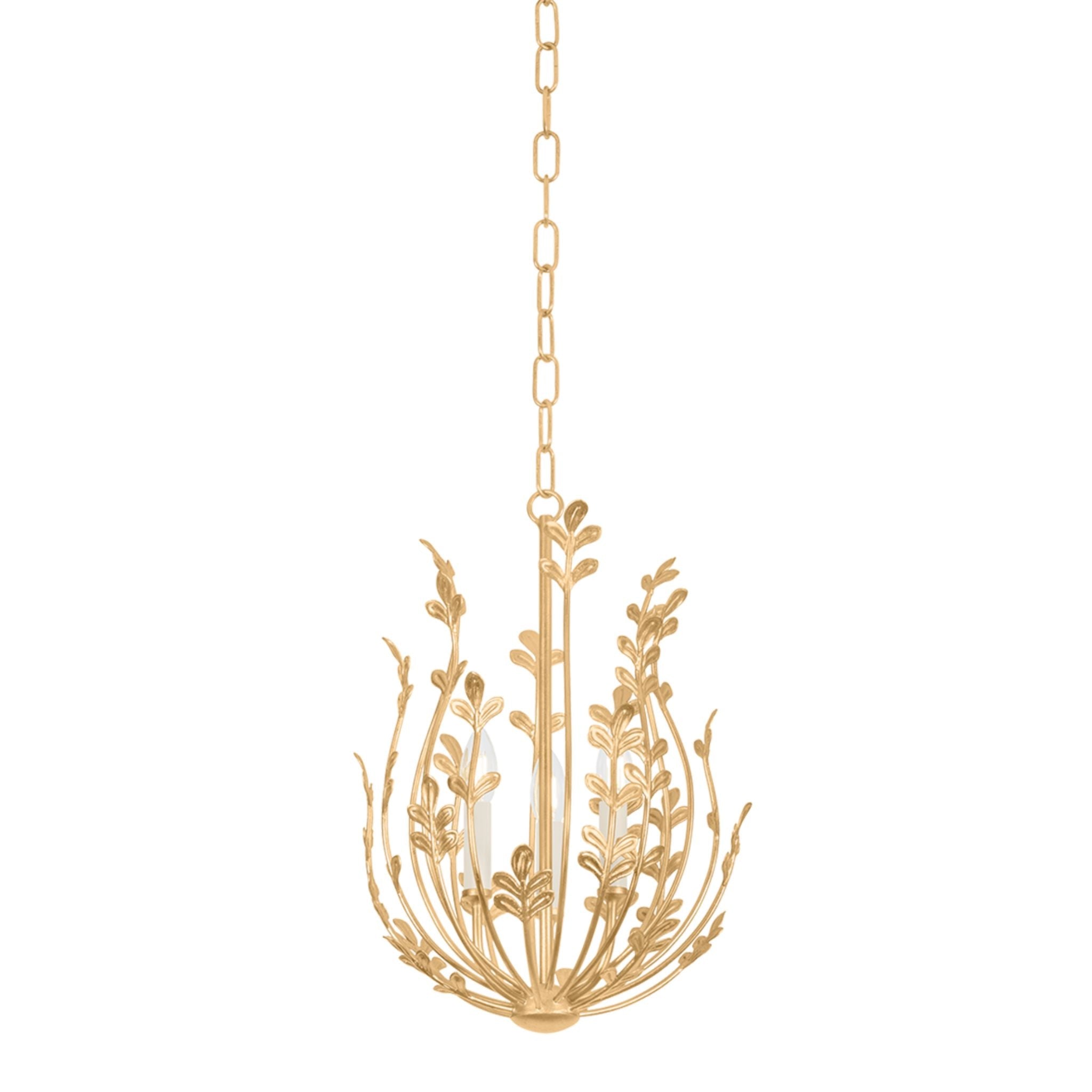 Somewhere between the concept of a pendant and a lantern floats the ethereal, botanically-inspired Delmore. Made of iron and finished in Vintage Gold Leaf, the airy frame features sprightly curving stems accented by etched leaf details. 3 candles are nested within the delicate composition, creating a bright and joyous celebration of nature.