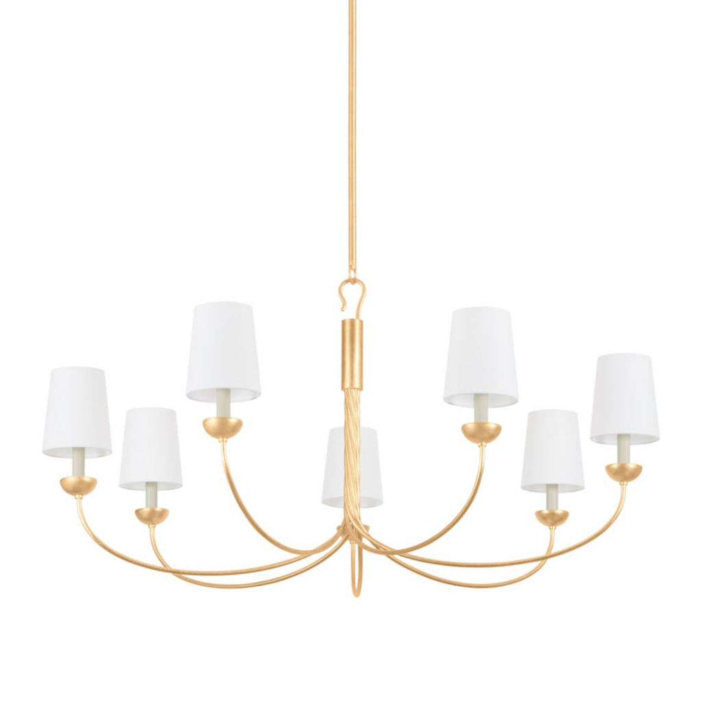 Stylish in its simplicity, the Montpelier chandelier features 7-candle sleeves topped with tapered white linen shades. A twisted central rod and distinctive hook-and-ring detail offer graceful support to the curved arms of this timeless silhouette. It is an elegant statement piece for a dining room or large gathering space.