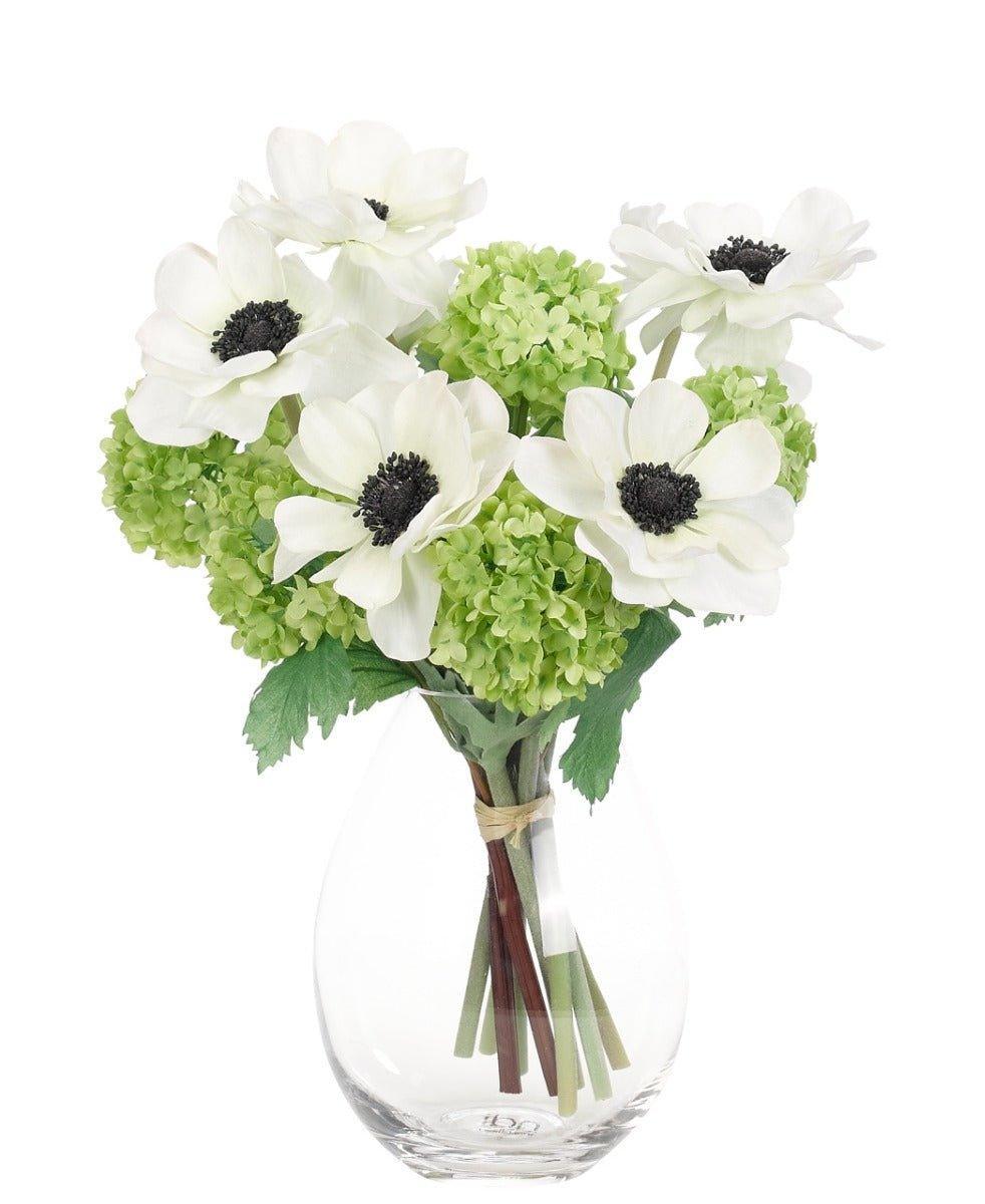 Faux Bouquet of White Anemone and Green Hydrangea in a Glass Teardrop Vase
