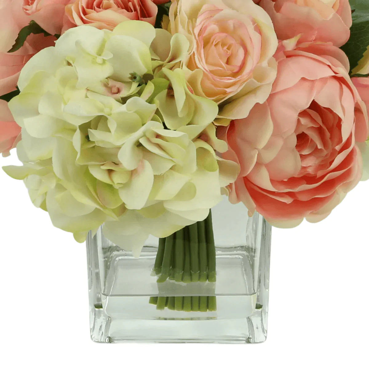 Faux roses, peonies, and hydrangeas in a square glass vase with acrylic water.