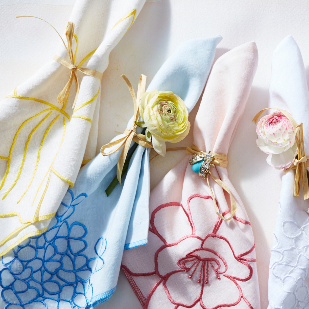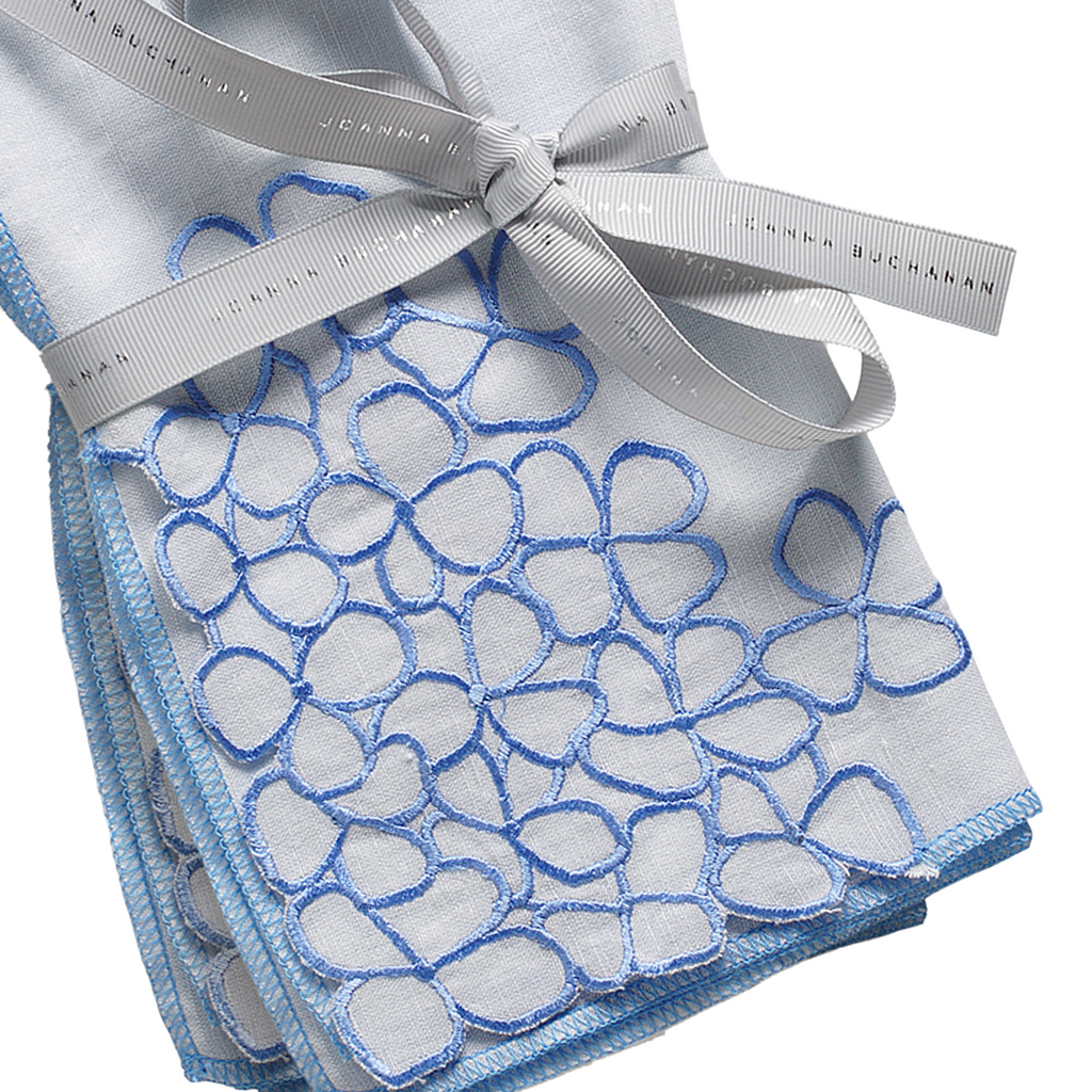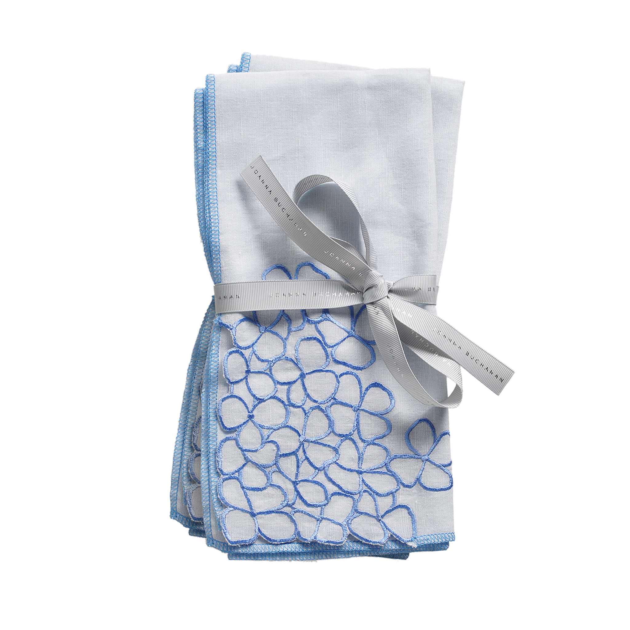 These super special dinner napkins are inspired by garden hydrangeas. The pattern was sketched by hand and then they are embroidered and hand-cut by artisans in India. These are perfect linen napkins for a garden party brunch or breezy dinner party. Fresh Spring blues!