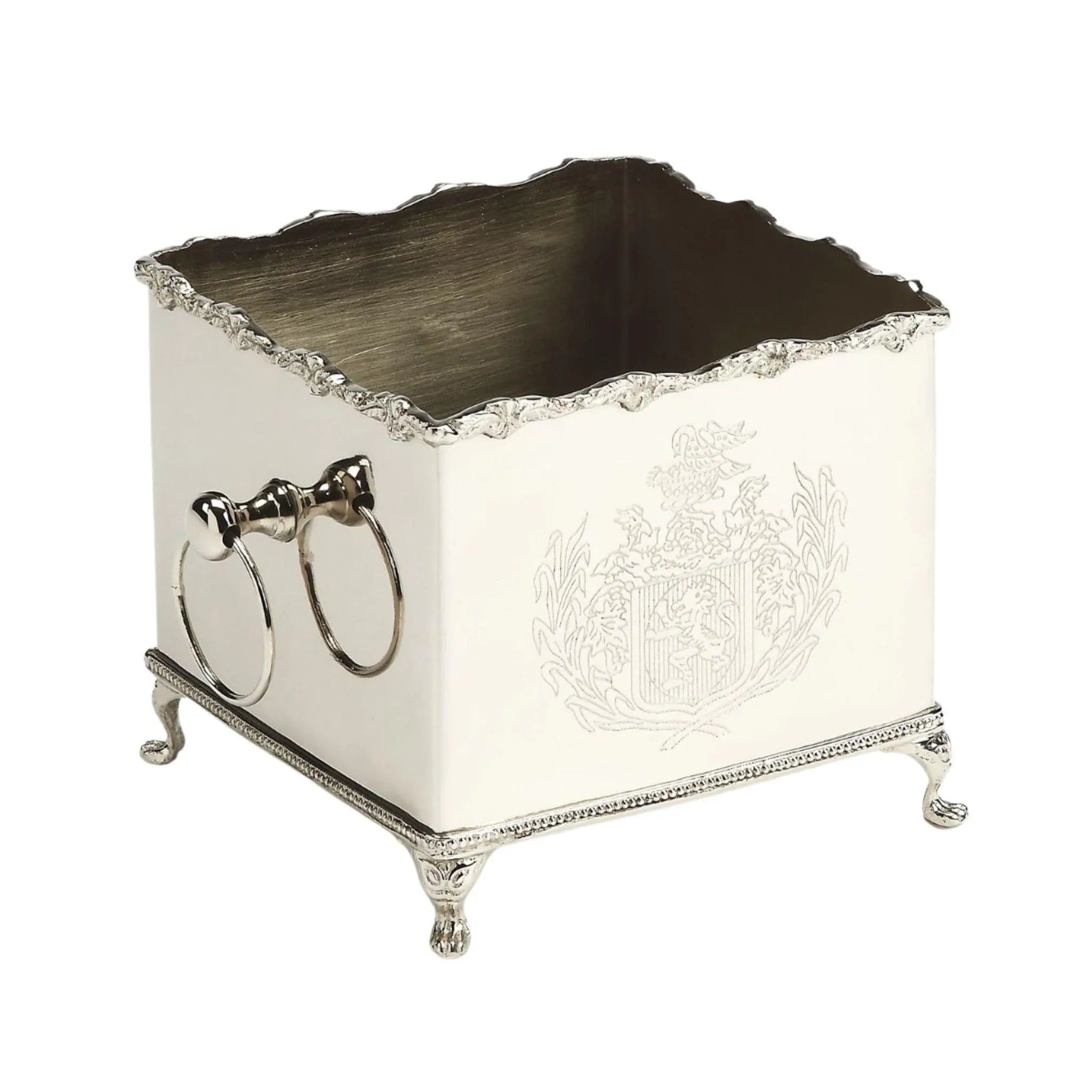 Silver Hued Brass Box Planter with Legs and Engraving Detail