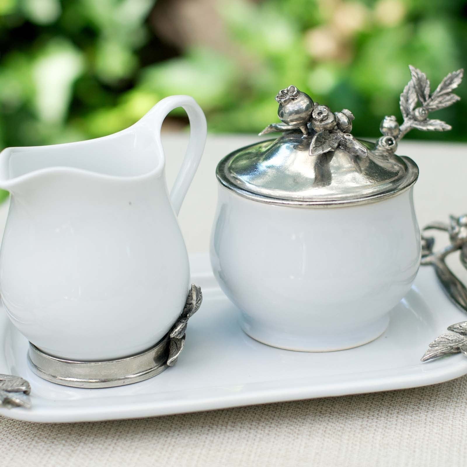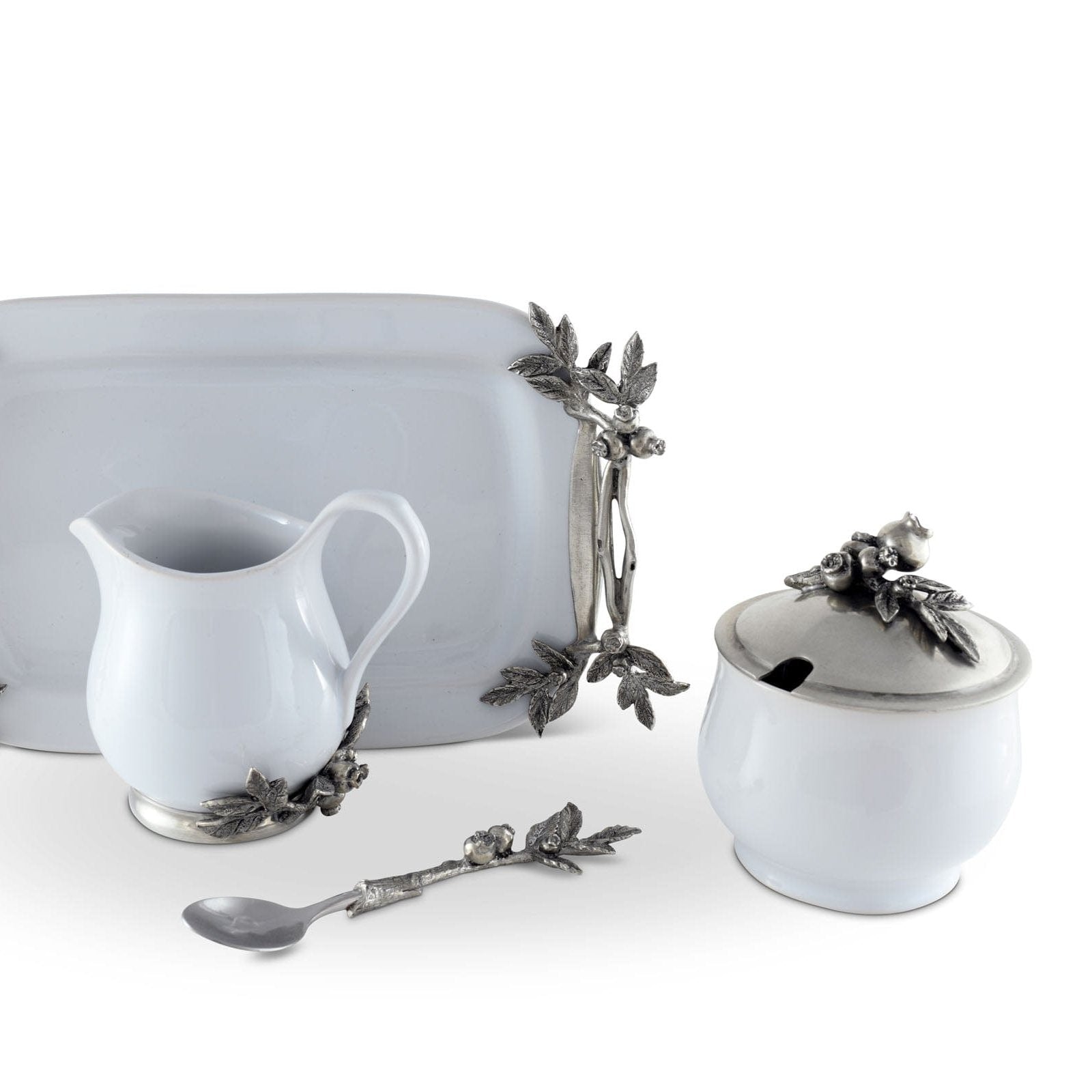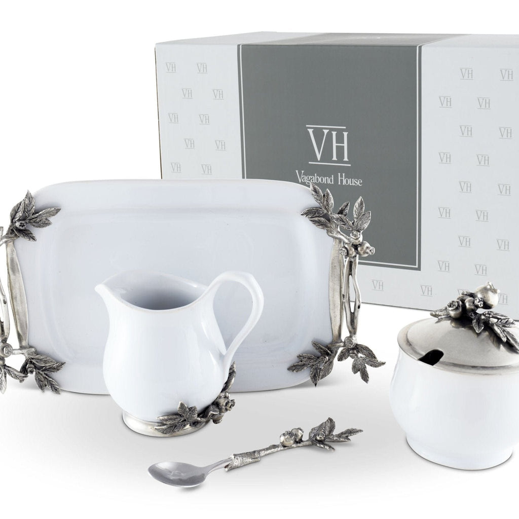 Crafted in elegant stoneware with pure-pewter accents, Vagabond House's Blueberry Creamer Set includes four classic pieces: creamer, serving tray, sugar bowl and sugar spoon.