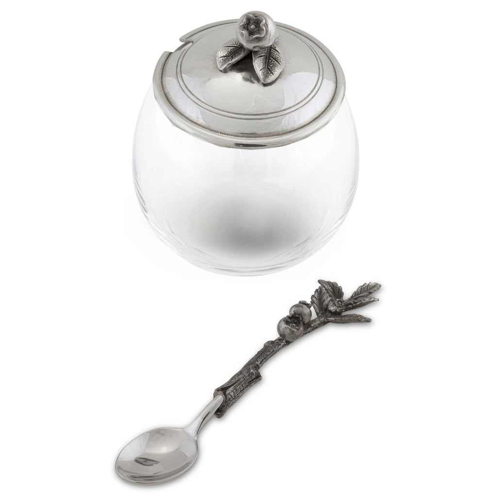 Crafted in the shape of a branch, the spoon's handle features more realistic fruit and foliage as accents. The remarkable detail within this pure-pewter design makes it appear darker than the lid.