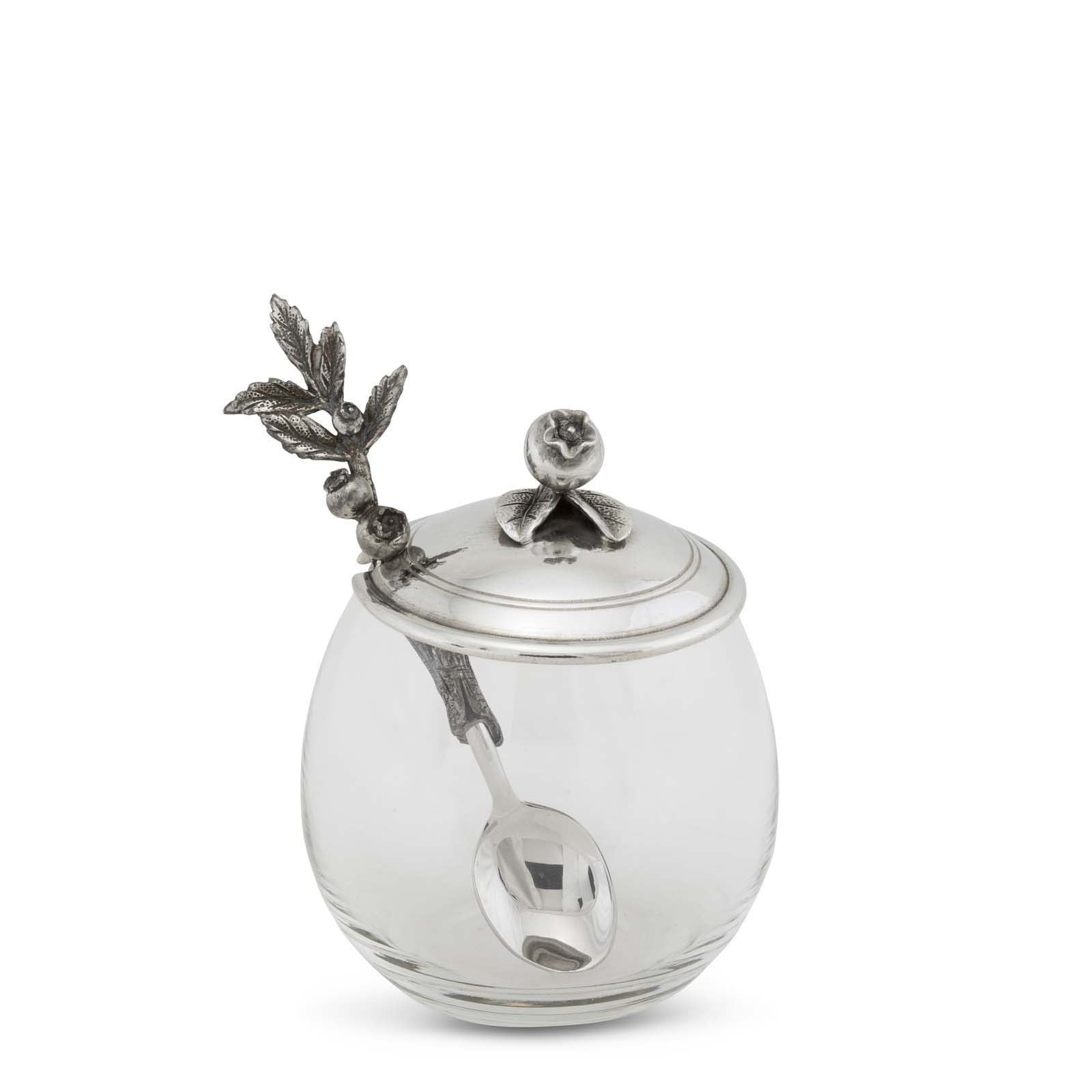 Differentiate between your favorite flavors of jam with Vagabond House's Blueberry Jar with Spoon. An elegant blueberry and leaf motif embellishes the cap, which covers a 12-ounce, glass bowl.