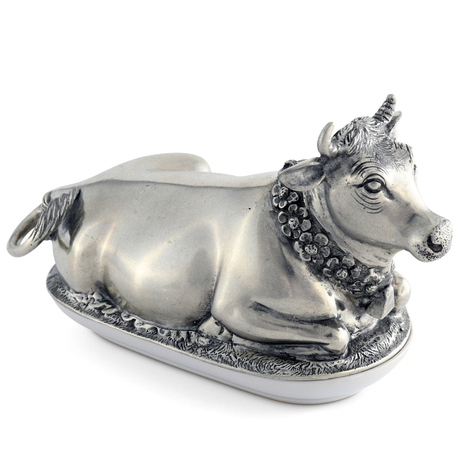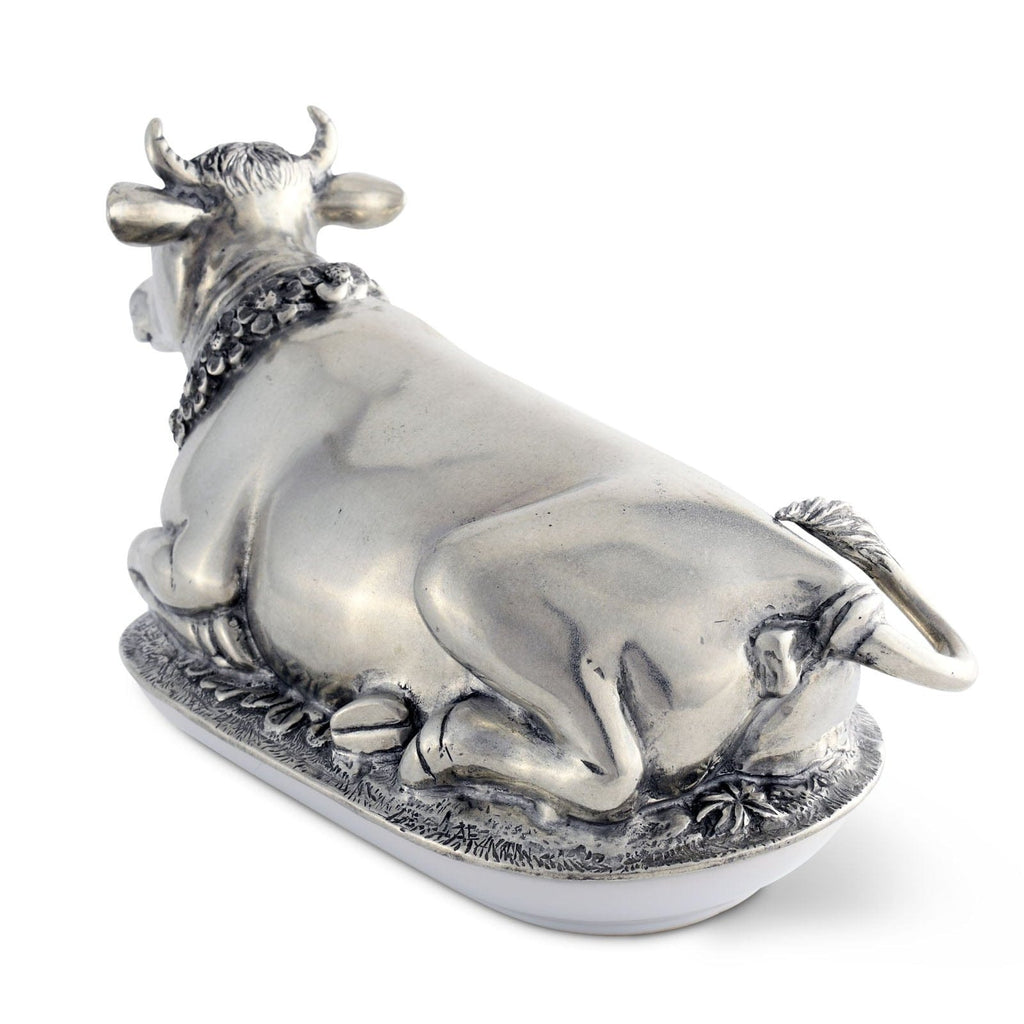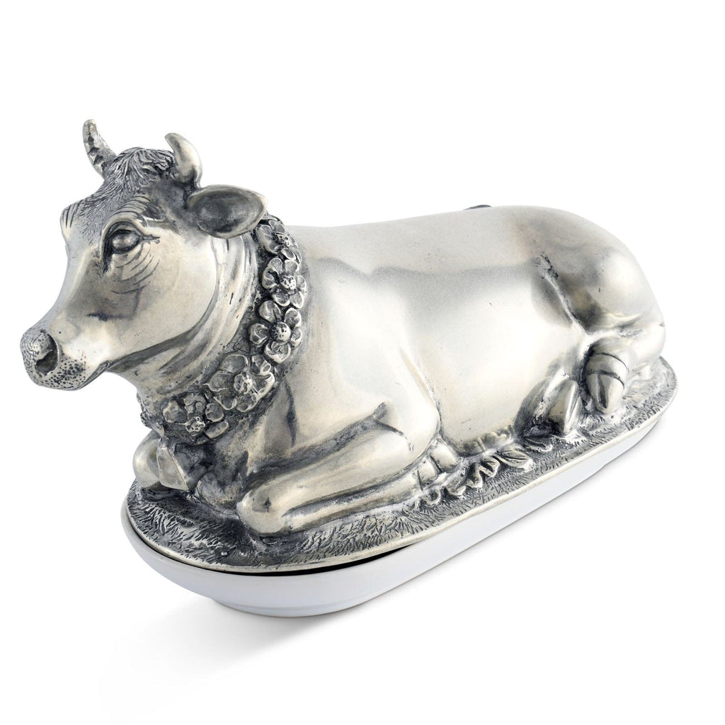 Mabel the cow wears beautiful garland of flowers and a cowbell. Realistically detailed in luxury-grade pewter, Mabel has a soft expression that brings calm to your table. Her legs and hooves curl up underneath her at the base of the lid, which covers the fine, replaceable stoneware butter plate.