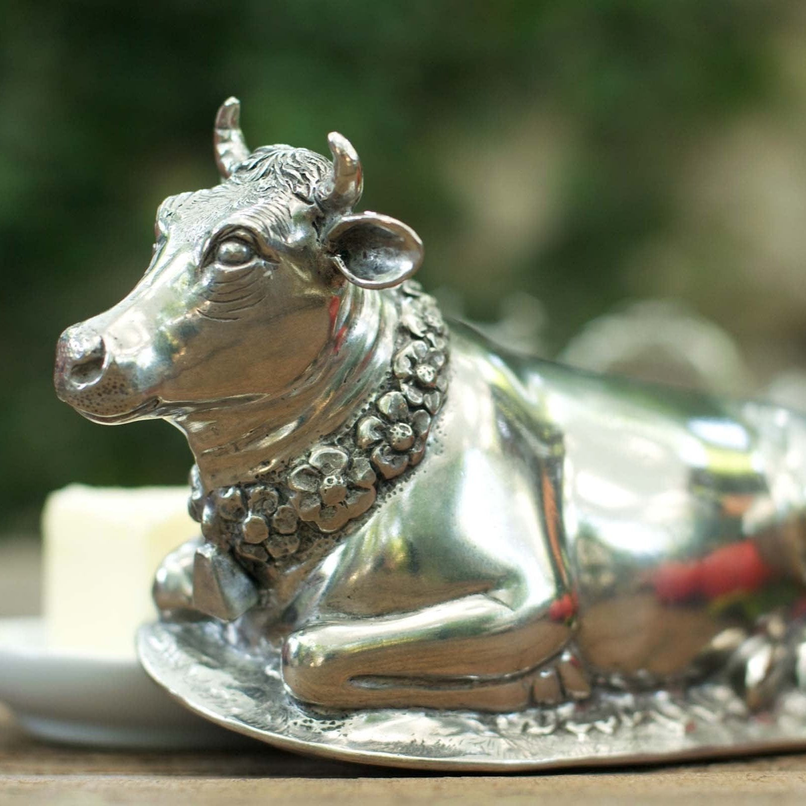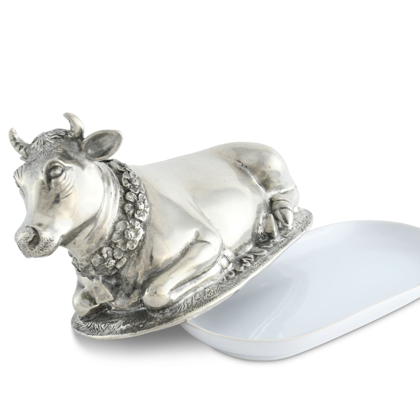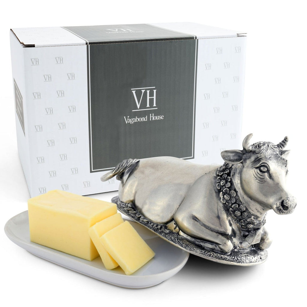 Mabel the cow wears beautiful garland of flowers and a cowbell. Realistically detailed in luxury-grade pewter, Mabel has a soft expression that brings calm to your table. Her legs and hooves curl up underneath her at the base of the lid, which covers the fine, replaceable stoneware butter plate.