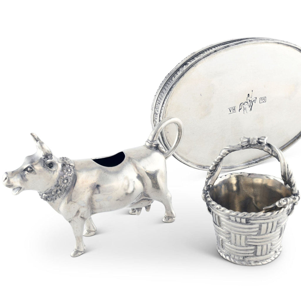 These pure-pewter designs are held in a barrel-shaped tray, which is crafted to resemble the intricacy of wood. Elegant bows embellish the handle of the pail and spoon, while Mabel sports an attractive wreath of flowers around her neck.