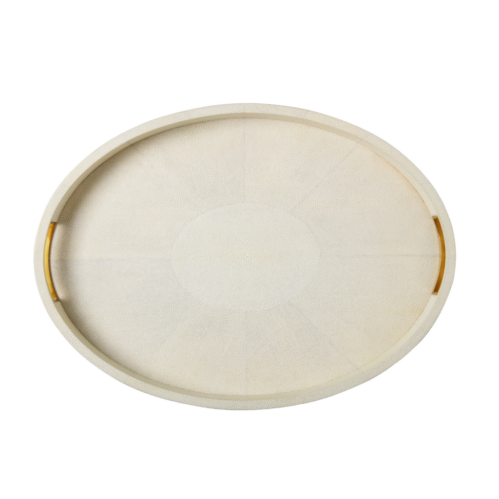 This stylish oval tray has a luxurious shagreen finish and integrated brass handles, which do not distract from the smooth beauty of its shape. Use it as an elegant home bar or for organizing objects on a bookshelf or table.