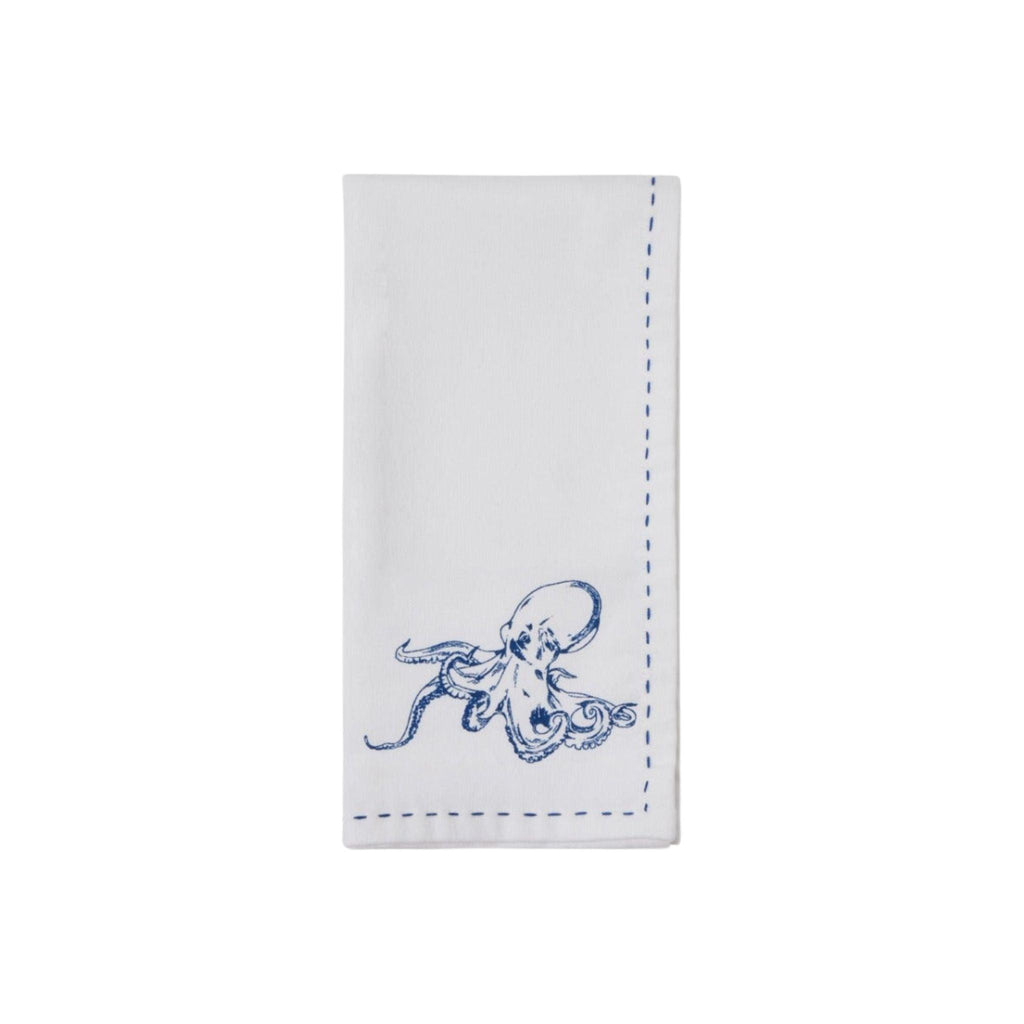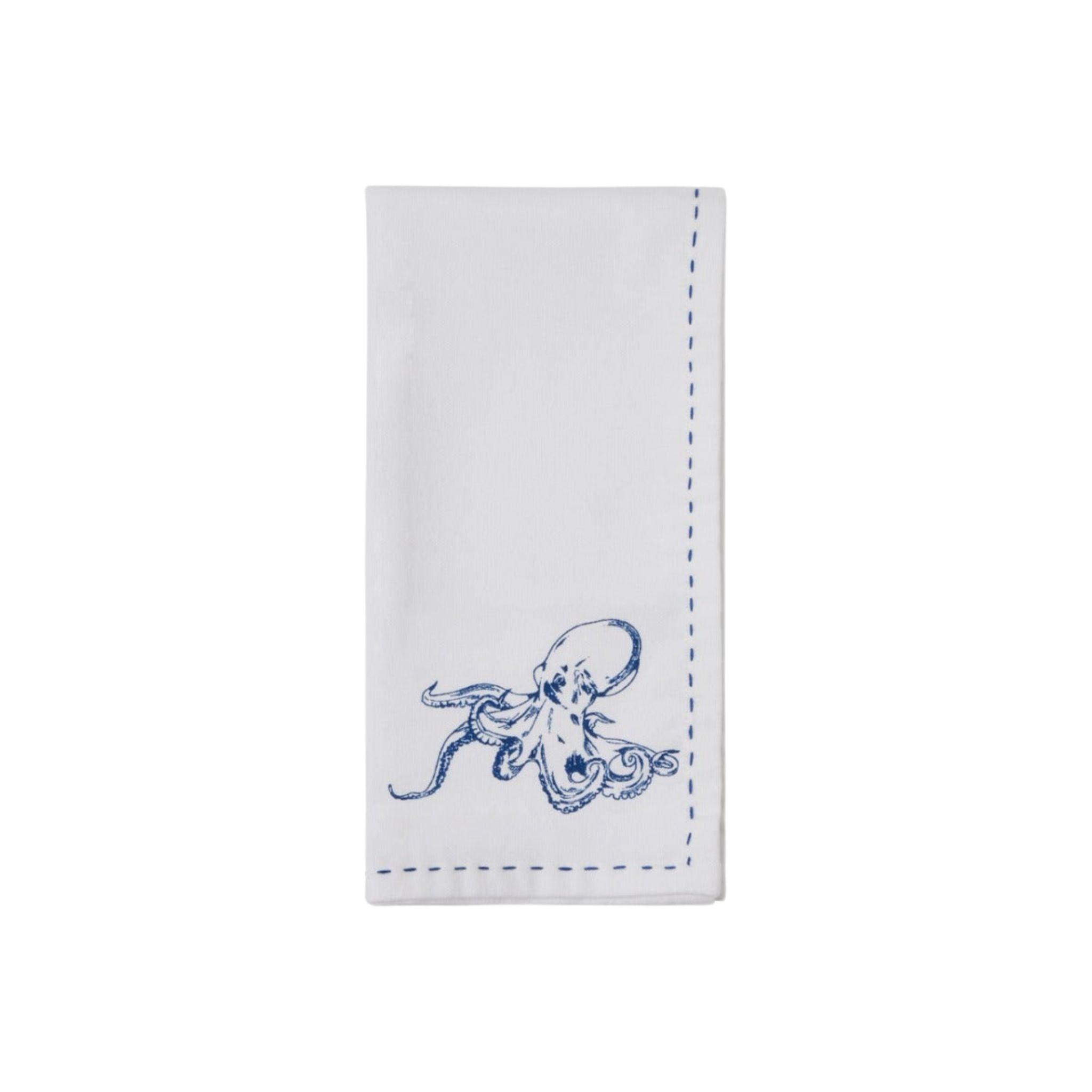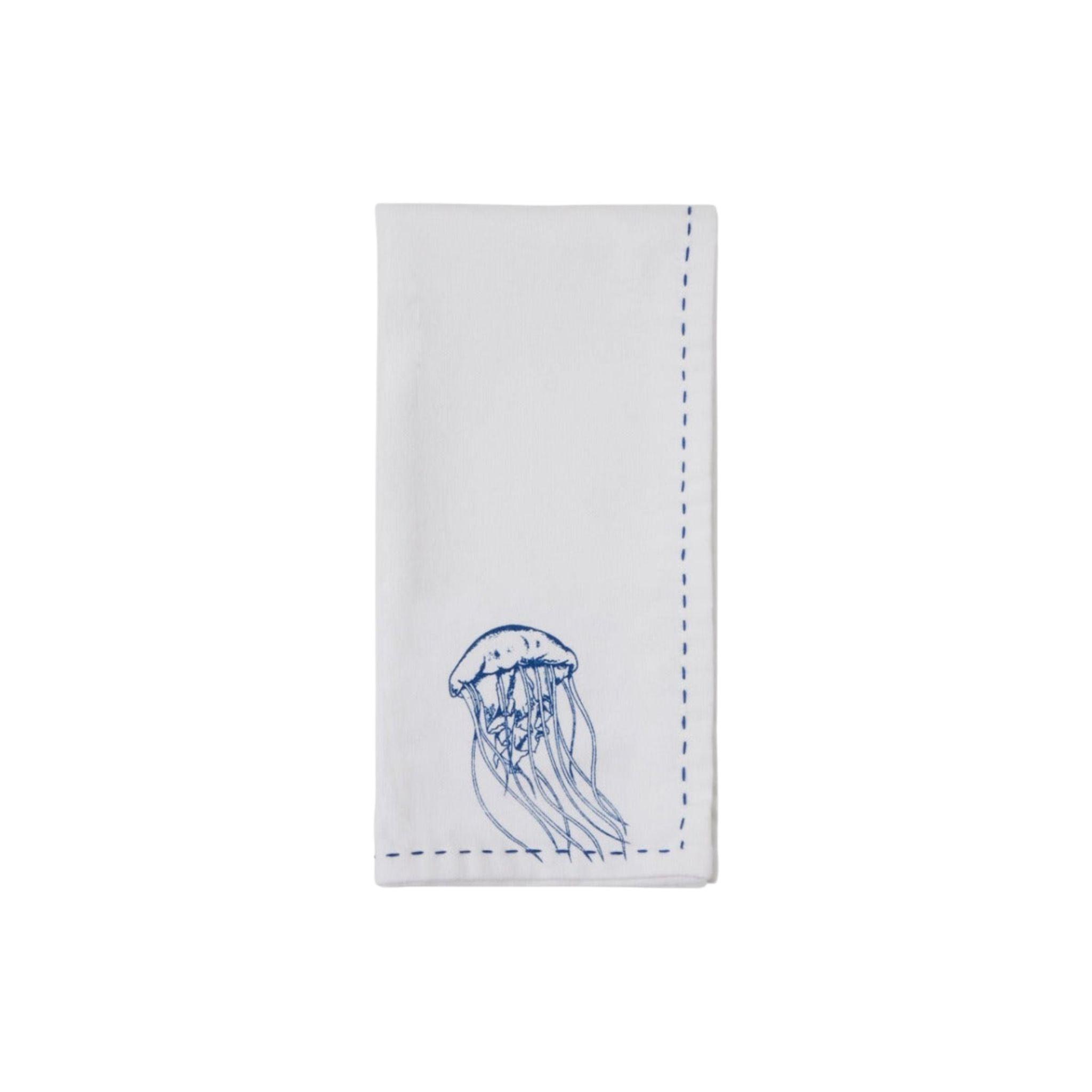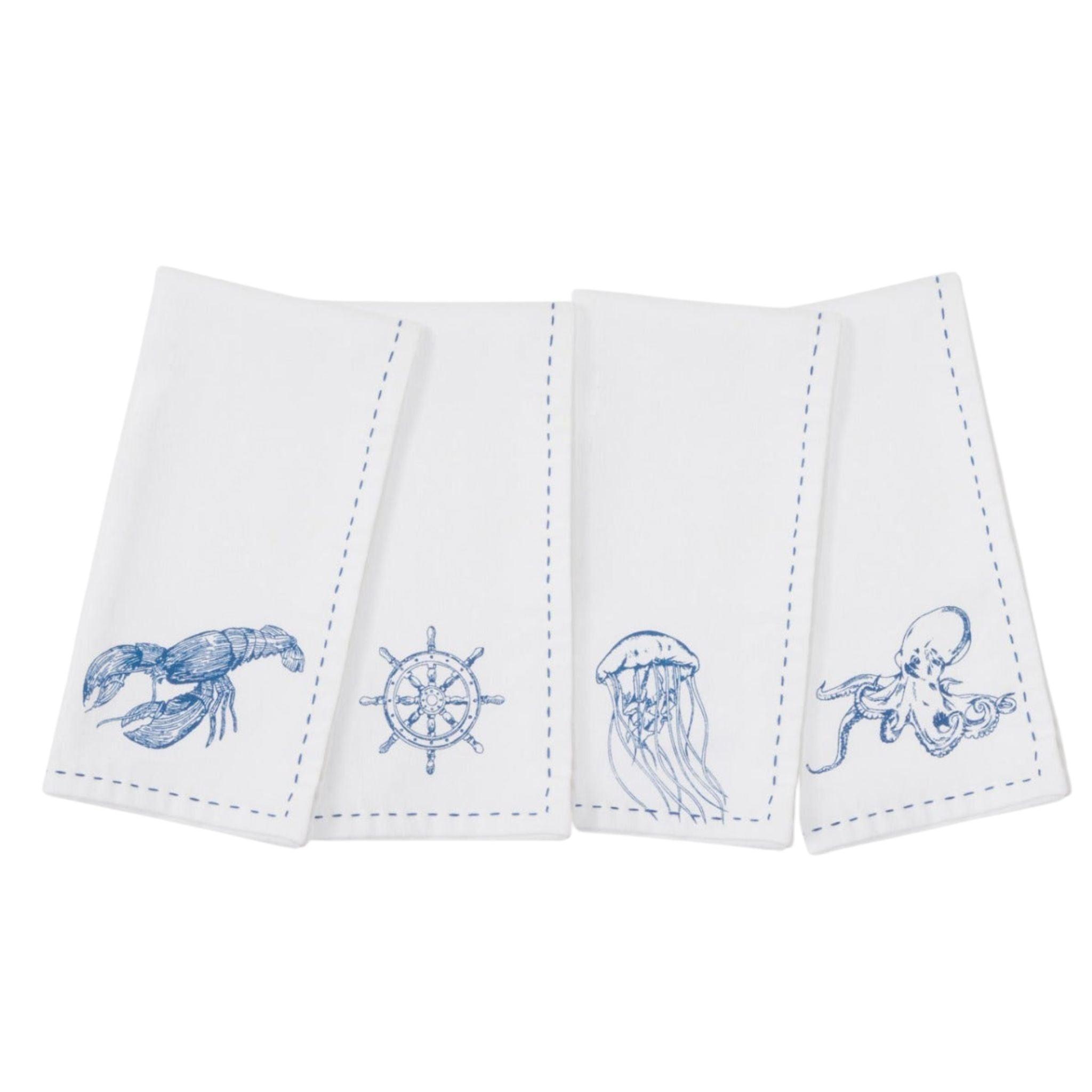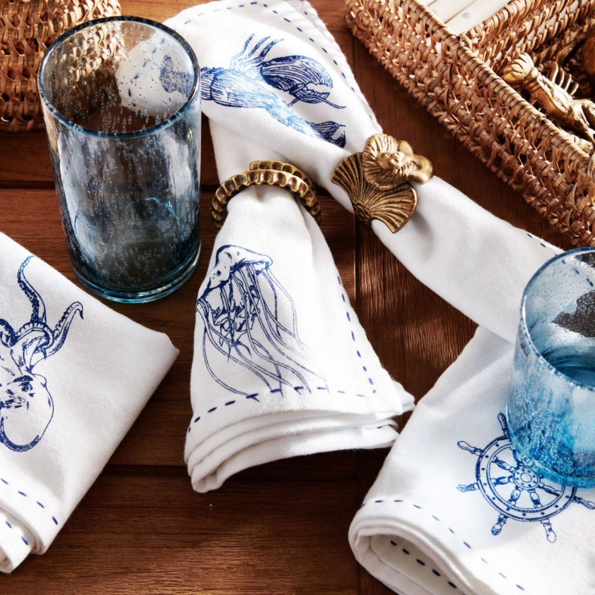 Inspired by life at sea, our Ariel napkin set serves up a nautical vibe. Each crisp white cotton square is stamped with a different oceanic illustration: a squid, a jellyfish, a lobster, and a ship’s helm.