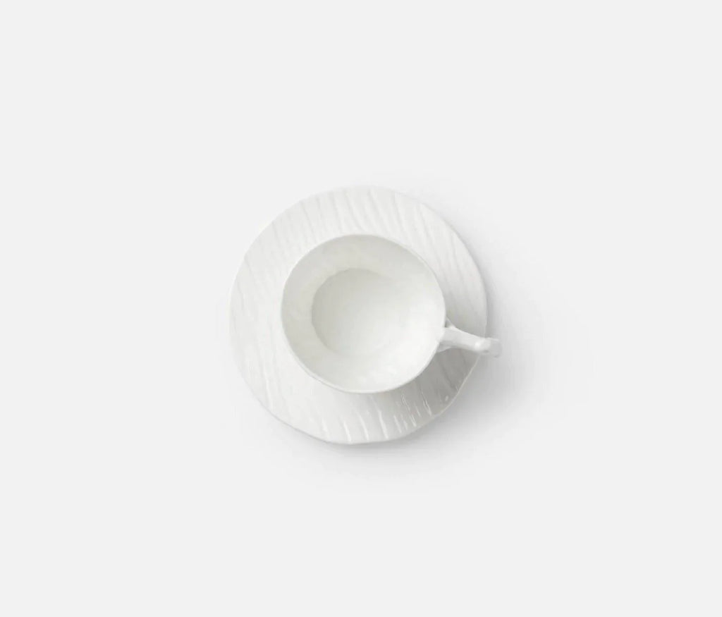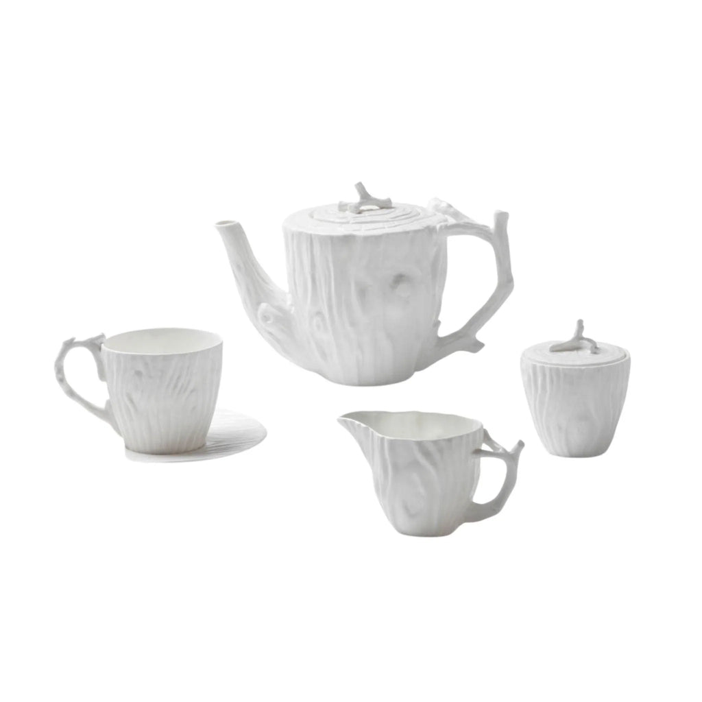 This White Faux Bois porcelain set features an oversized pot with a long spout and twig-shaped handle, a sugar pot, and creamer. Matching cups and saucers round out the set.