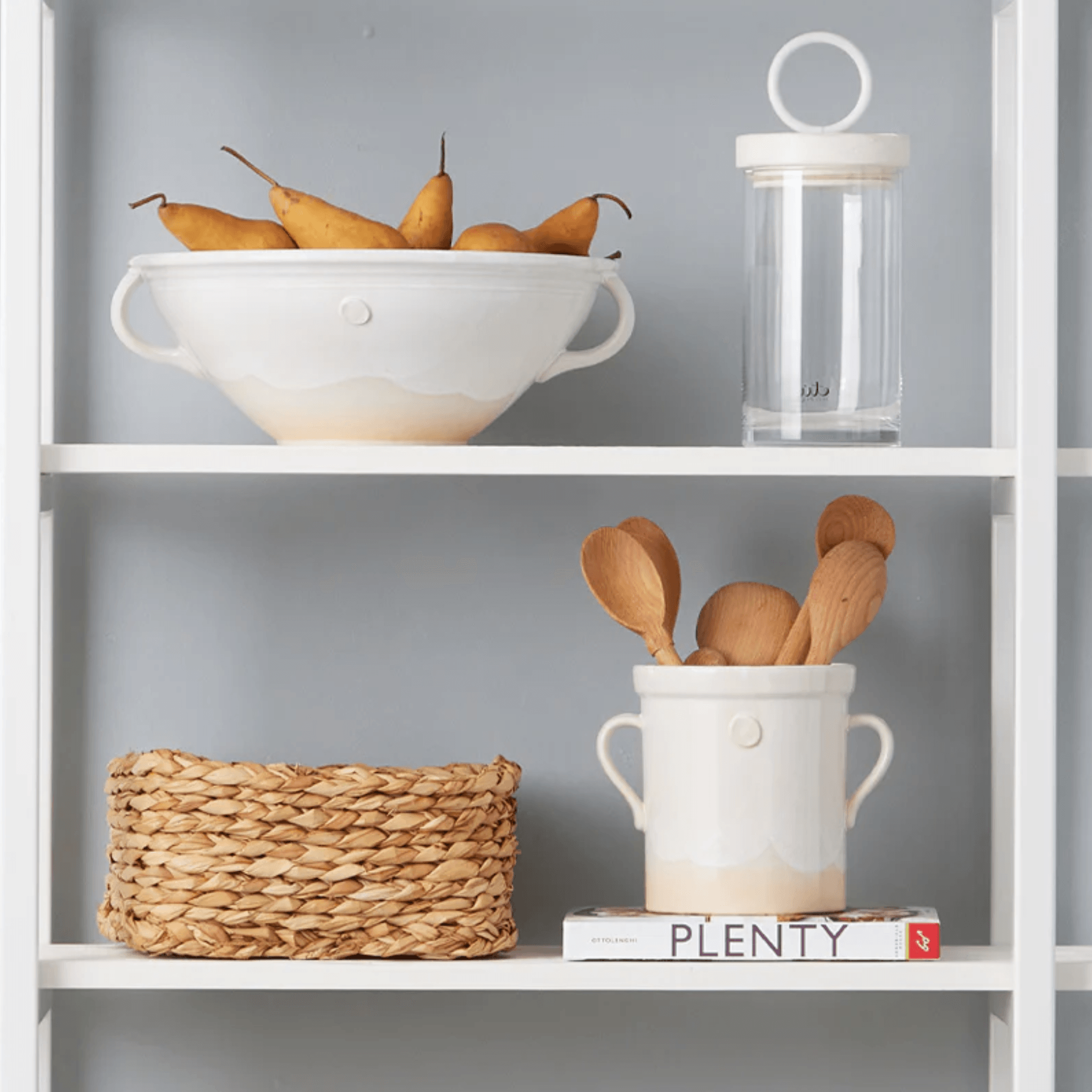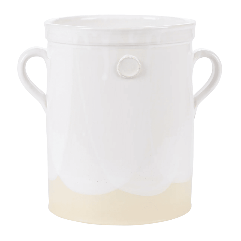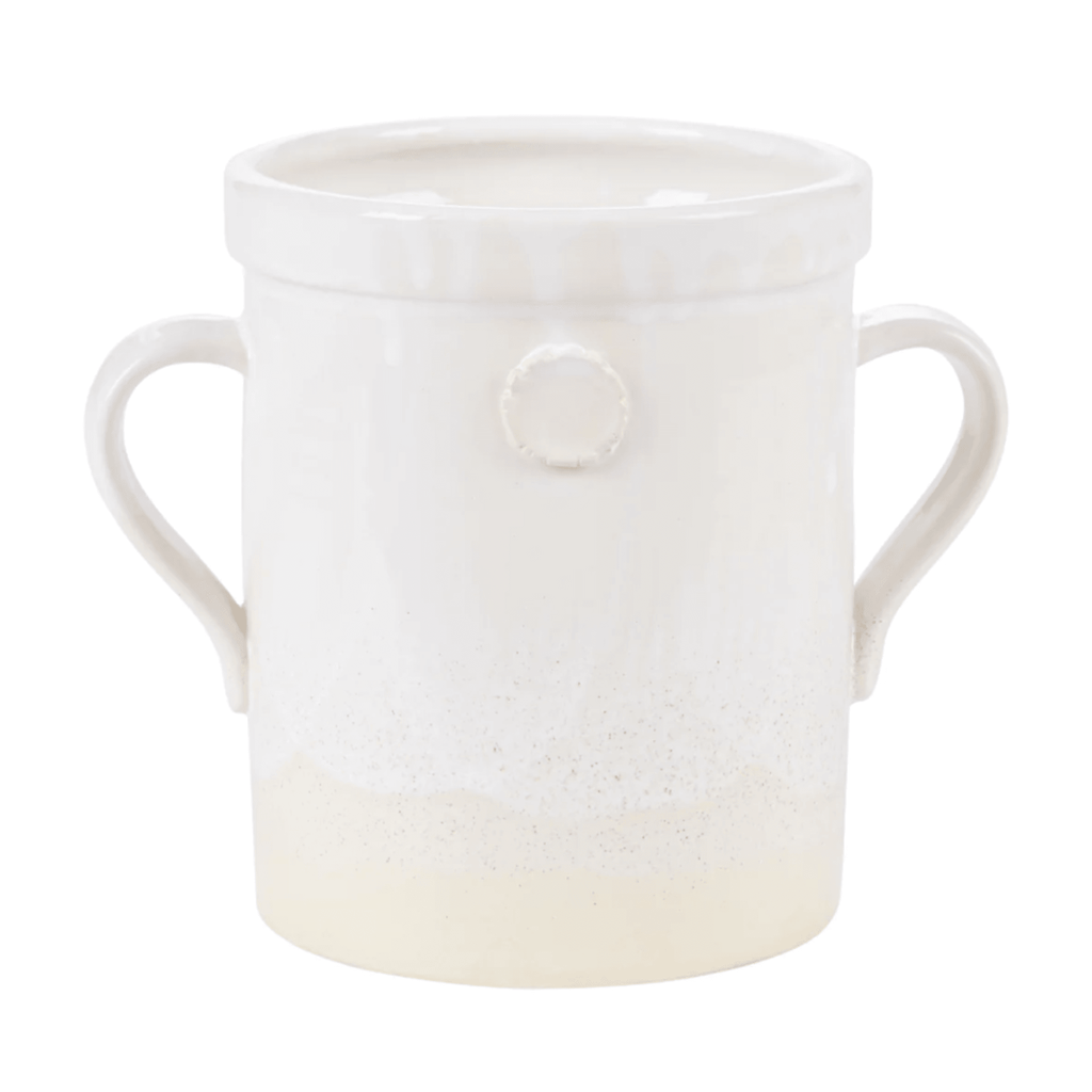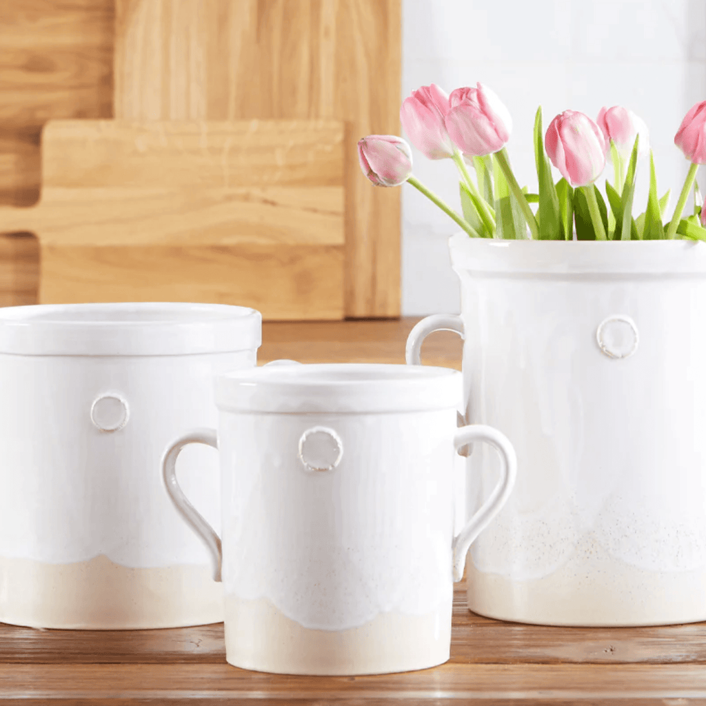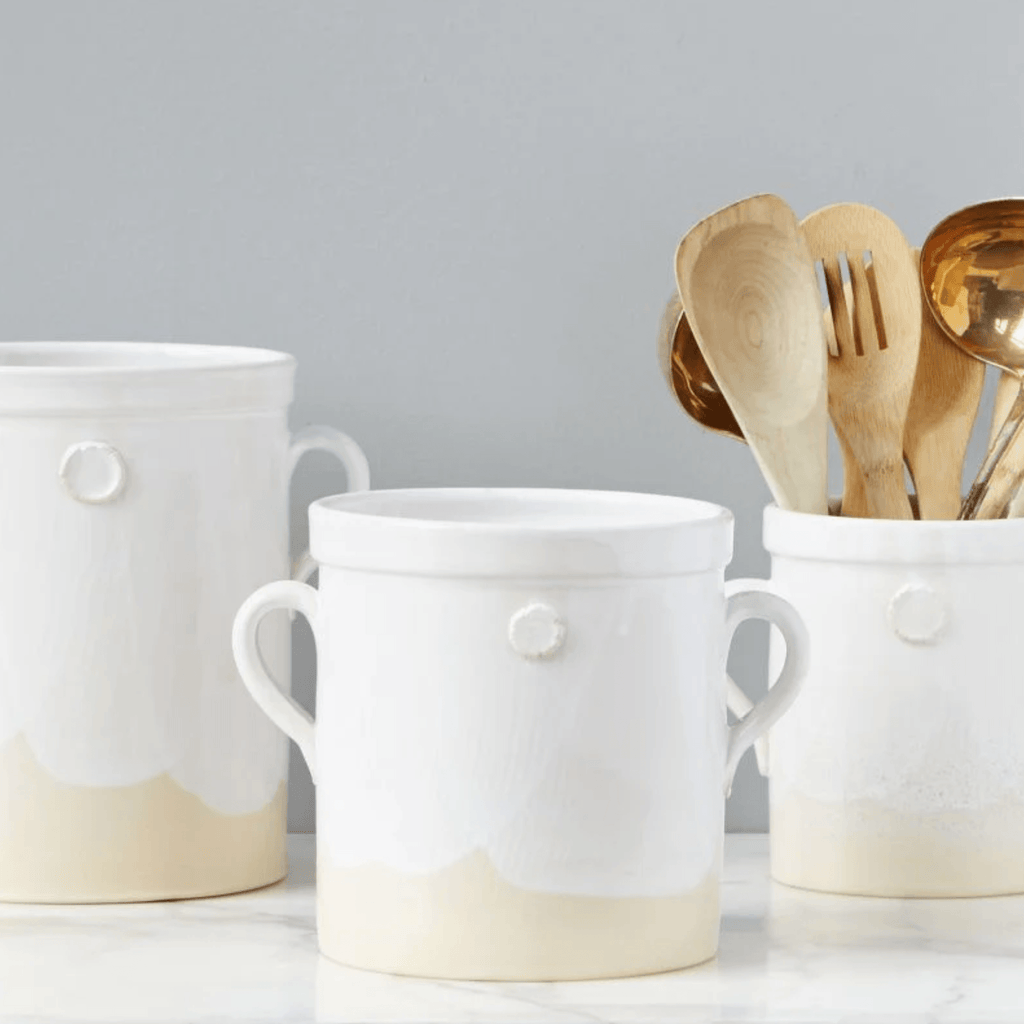 The utensil crocks were inspired by an Italian staple, the olive jar. The ceramic pots come in three sizes, small, medium, and large, each exerting the same effortless beauty as the next. With a clay seal on each side and sturdy handles, the jar is the ideal utensil holder next to your stove or as a flower vase on your counter.