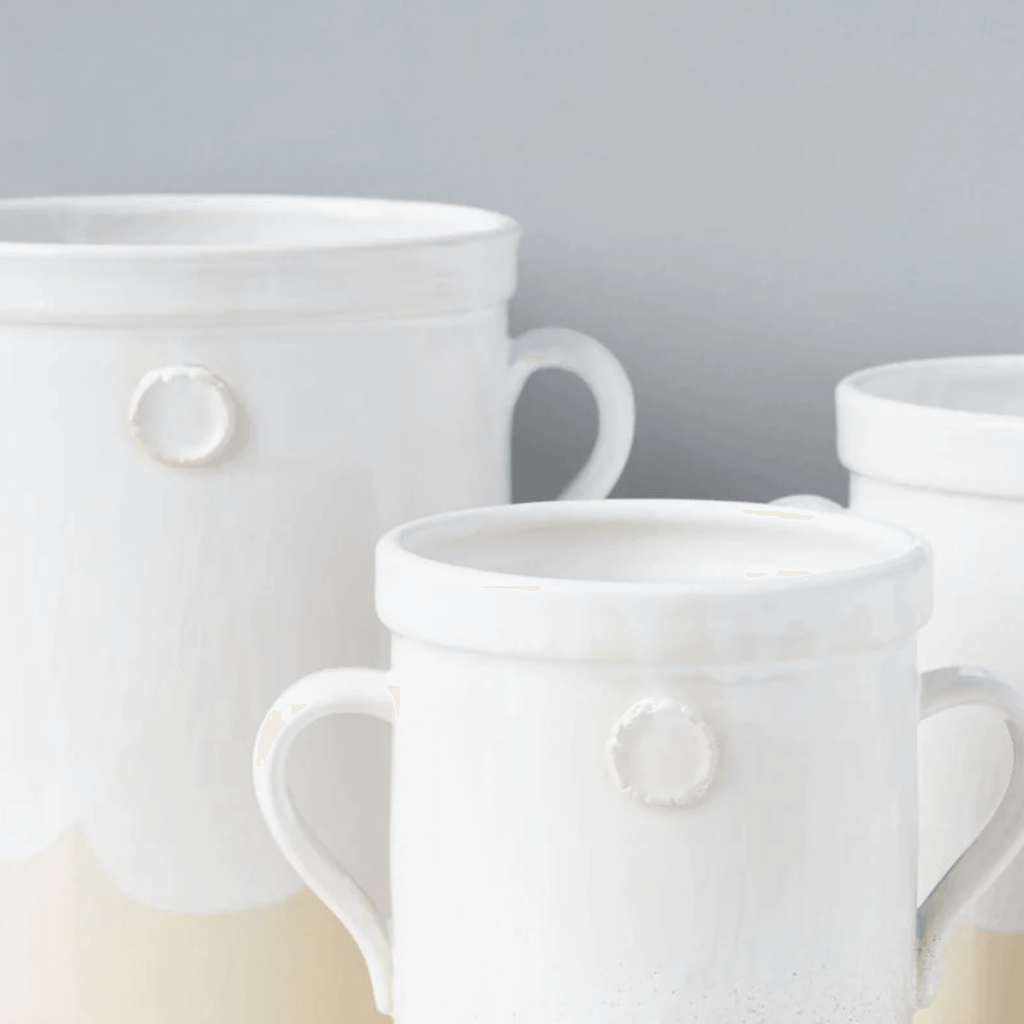 Handcrafted from white European clay, the Handthrown Pottery Collection is created by European artisans on an original potter’s wheel. The pieces are inspired by classic European kitchens, mixing traditional designs with contemporary style. While each item is different and will vary due to the handcrafted technique used to create them, each piece boasts a unique lush glaze to enhance authenticity. The raw clay is left untouched on the bottom, while the top portion is dipped in a warm, white lead-free, non-toxic glaze for the perfect mix of traditional design and contemporary style.