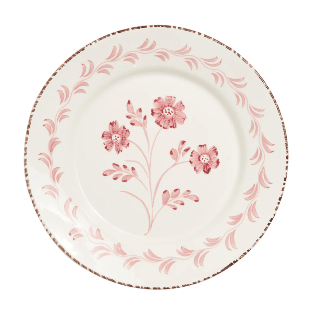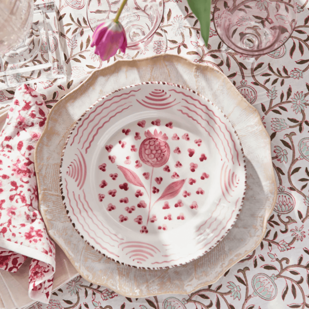 A new take on an old tradition. Enjoy our new collection of pink and white hand-painted plates influenced by the beautiful antique Portuguese and Spanish Talevera.
