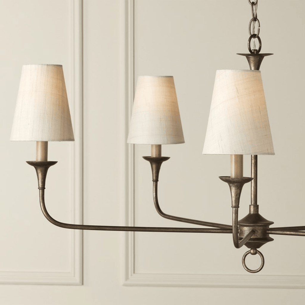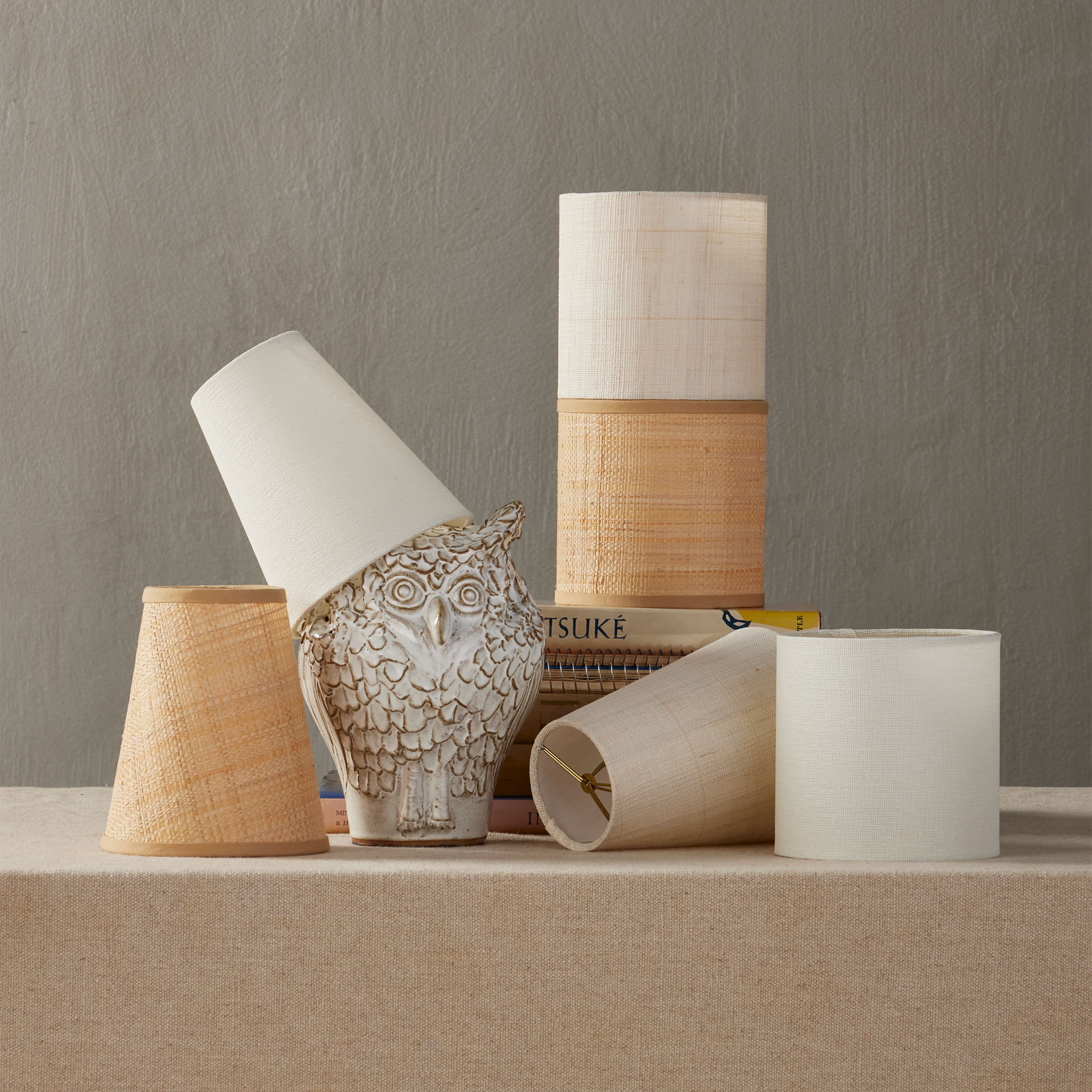 Petite shades made of a finely woven grasscloth bring added warmth to a space. Due to the natural material's inherent texture, there is a knotty richness to their surfaces, though the lighter hues are so delicate they read like linen. In fact, the shades for chandeliers and wall sconces in this collection are of the finest weaves made by hand, evidenced by the tiny telltale knots along the surface that prove they are the ultimate definition of artisanal. Click images for greater detail.
