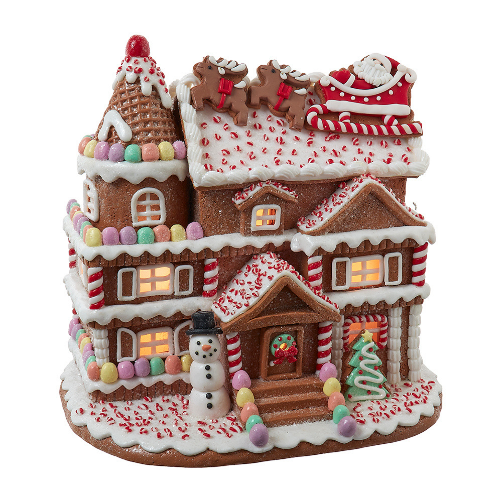 Kurt Adler's 10" Pre-Lit Gingerbread House With Santa is a delightful and whimsical holiday decoration that captures the charm and sweetness of the holiday season. This tabletop decoration features a gingerbread house adorned with festive details and comes with an accompanying Santa figurine. The gingerbread house is typically made from a combination of materials like resin or plastic to resemble the look of a real gingerbread house, complete with candy cane accents, gumdrops, and icing-like details. It is pre-lit with warm white lights, creating a cozy and inviting glow that adds to the enchantment of the piece. Santa's presence creates a warm and joyful atmosphere, as he appears to be delivering presents or sharing in the festivities. The combination of the gingerbread house and Santa figurine evokes the spirit of giving, joy, and the cherished traditions associated with Christmas. It is a lovely addition to your holiday decor, serving as a heartwarming reminder of the holiday season's whimsy and merriment. It creates a festive atmosphere that celebrates the magic of Christmas and the joy of sharing the holiday with loved ones.
