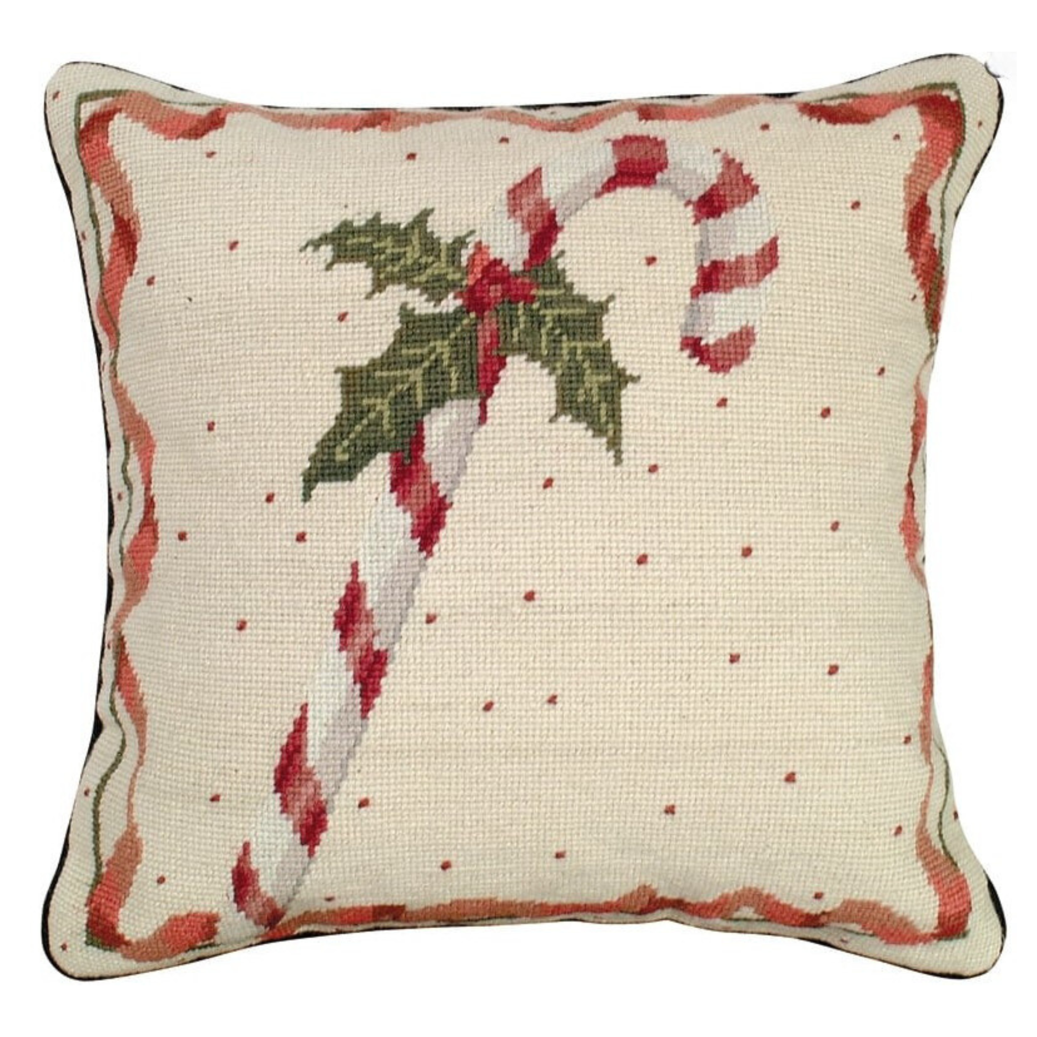 Traditional colors and a ribbon style border make this hand stitched Christmas throw pillow an instant classic. The careful attention to detail makes the candy cane appear realistic. Features a cotton velvet zippered back.  Click image for greater detail.