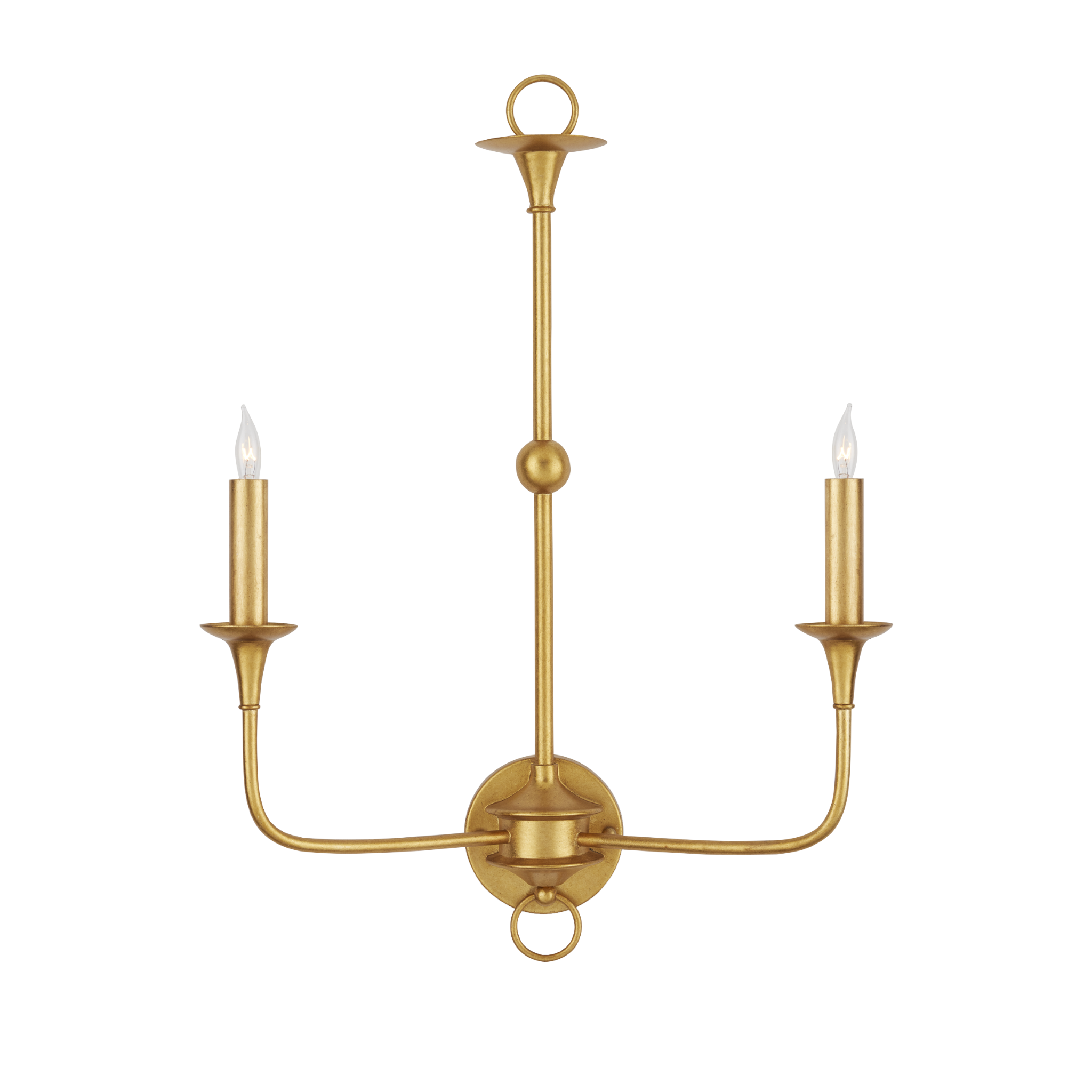 The arms of the Nottaway Gold Large Wall Sconce stretch gracefully from a half-spool shape that rests at the bottom of its stem, ornamented with a dainty ring. Though this is a seriously minimalist fixture, the profile of the gold wall sconce has a lovely fluidity to it that also makes it a natural choice for traditional and transitional interiors. The contemporary gold leaf finish on the wrought iron frame adds a very subtle textural interest.