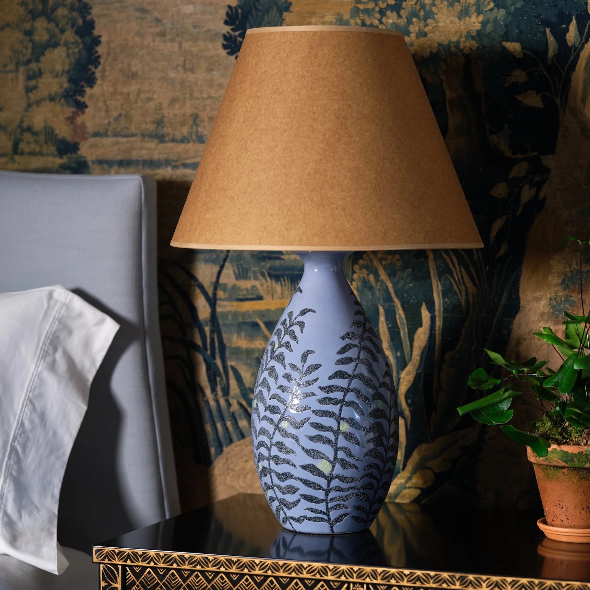 This hand-glazed ceramic lamp features a delicate unfurling fern motif and a serene blue glaze accented by earthen-toned matte details. Each unique, kiln-fired piece boasts a svelte silhouette.