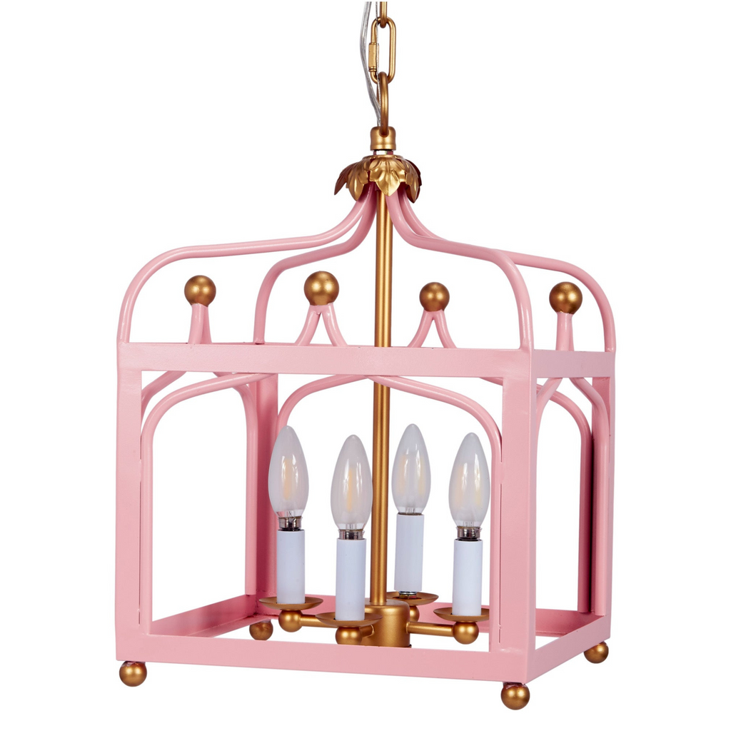 The blush pendant with elegant gold details and hardware is a sophisticated lighting option.