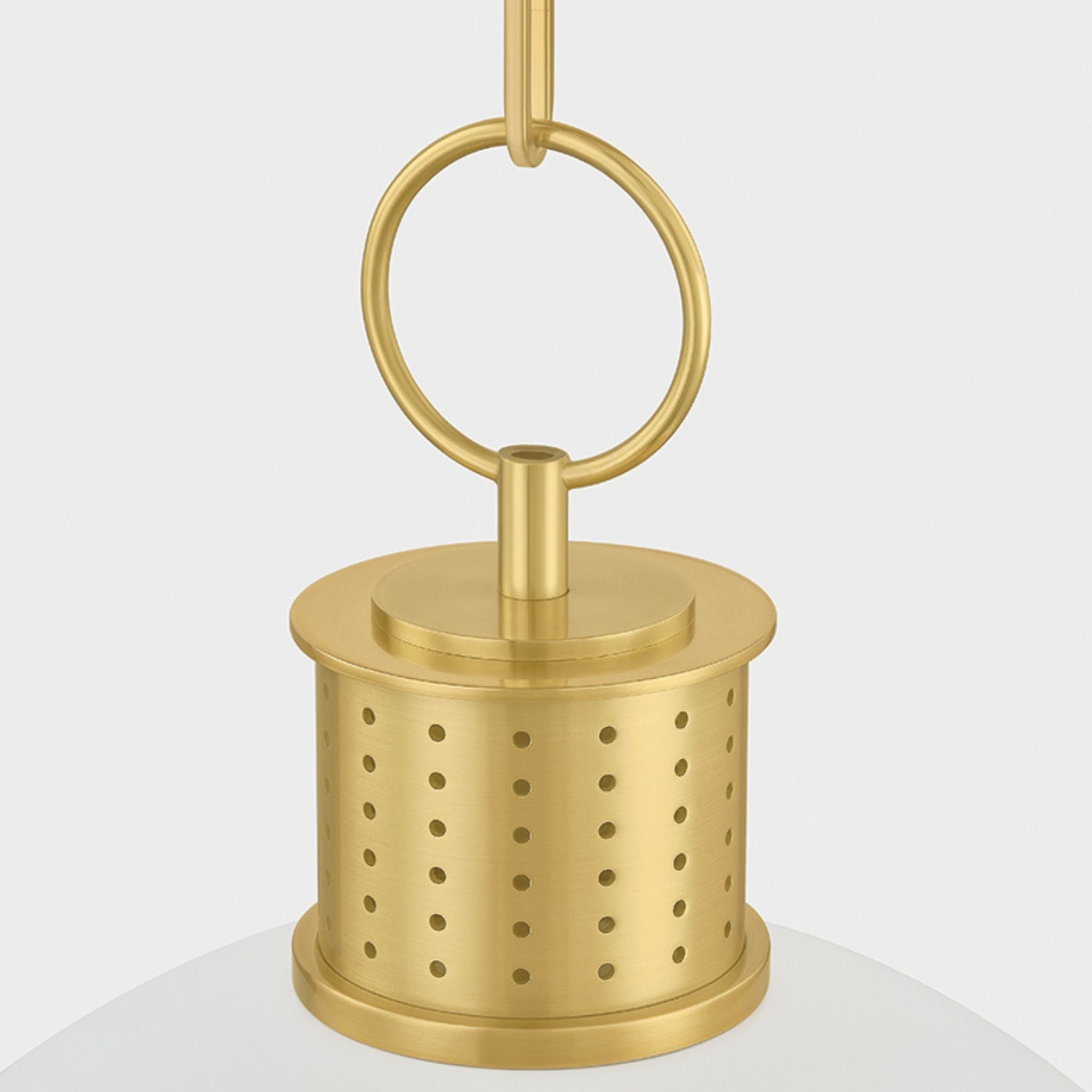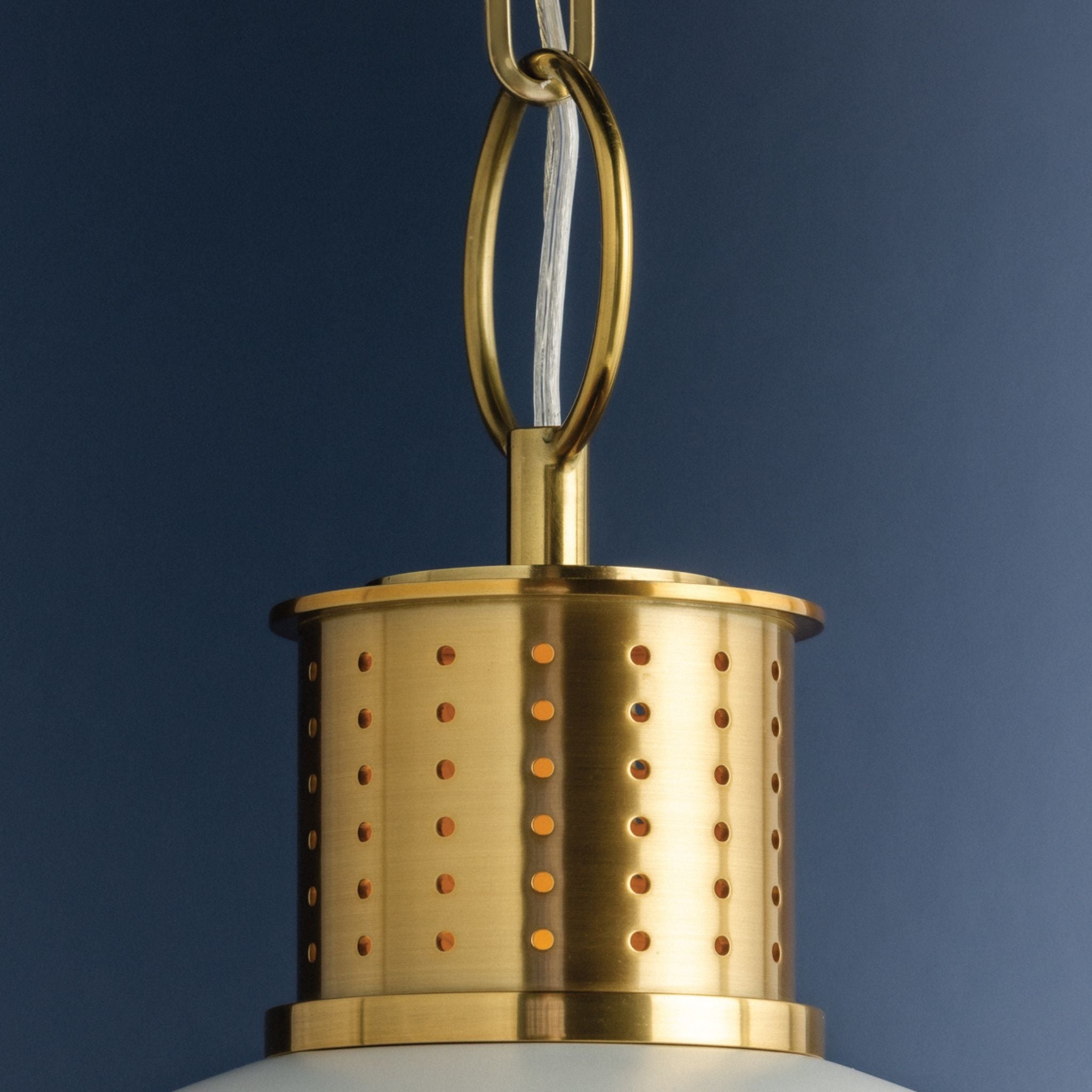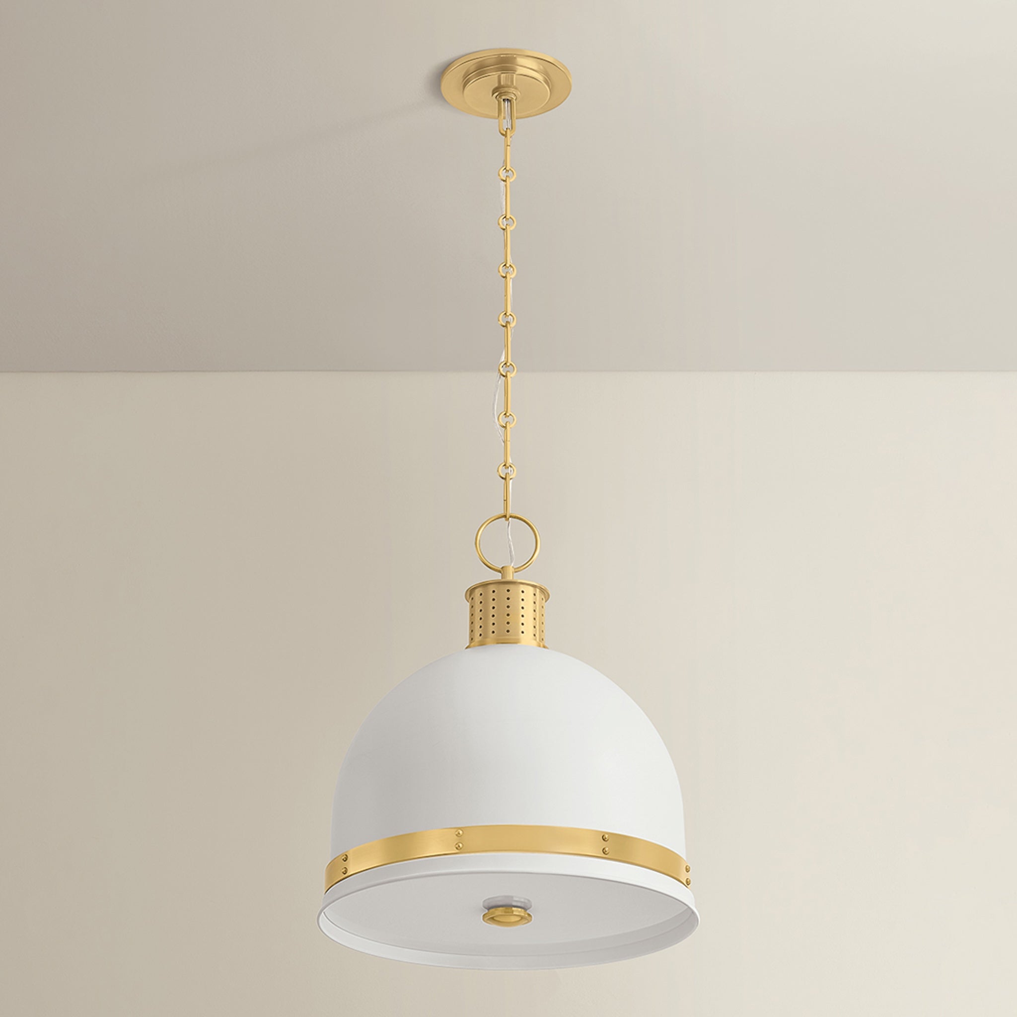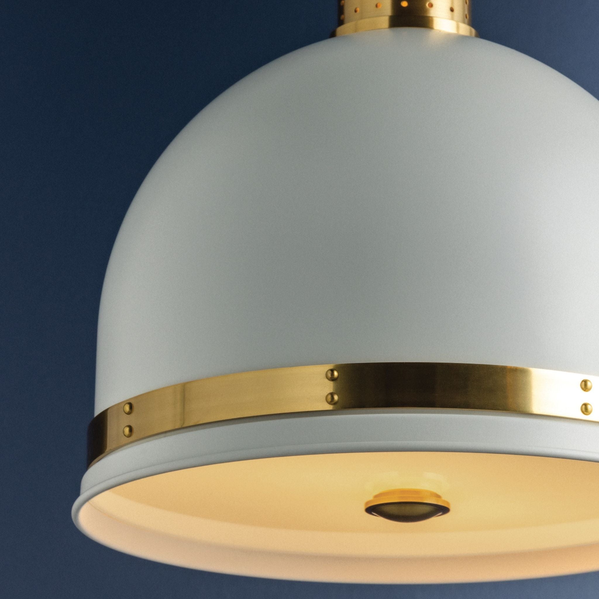 The Briscoe Pendant modernizes the classic RLM silhouette with matte Soft White paint, a white glass diffuser, and bold perforated and studded details. Suspended from an aged brass chain and hardware, it brings bright, versatile style to kitchens, dining areas, or entryways.
