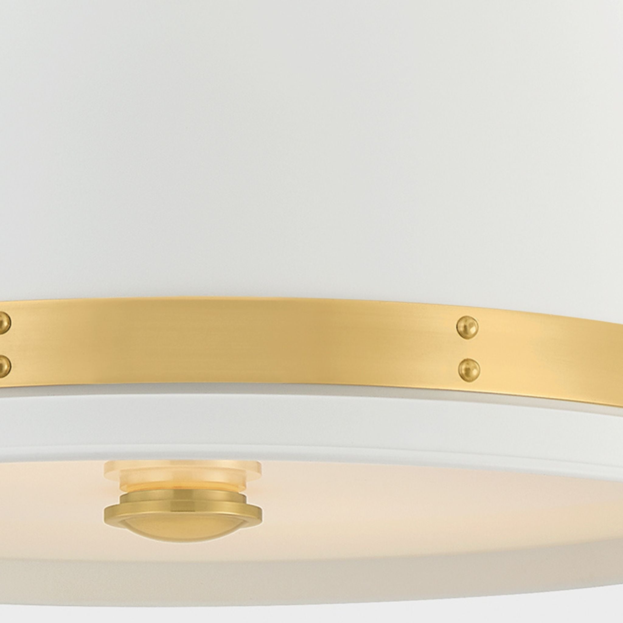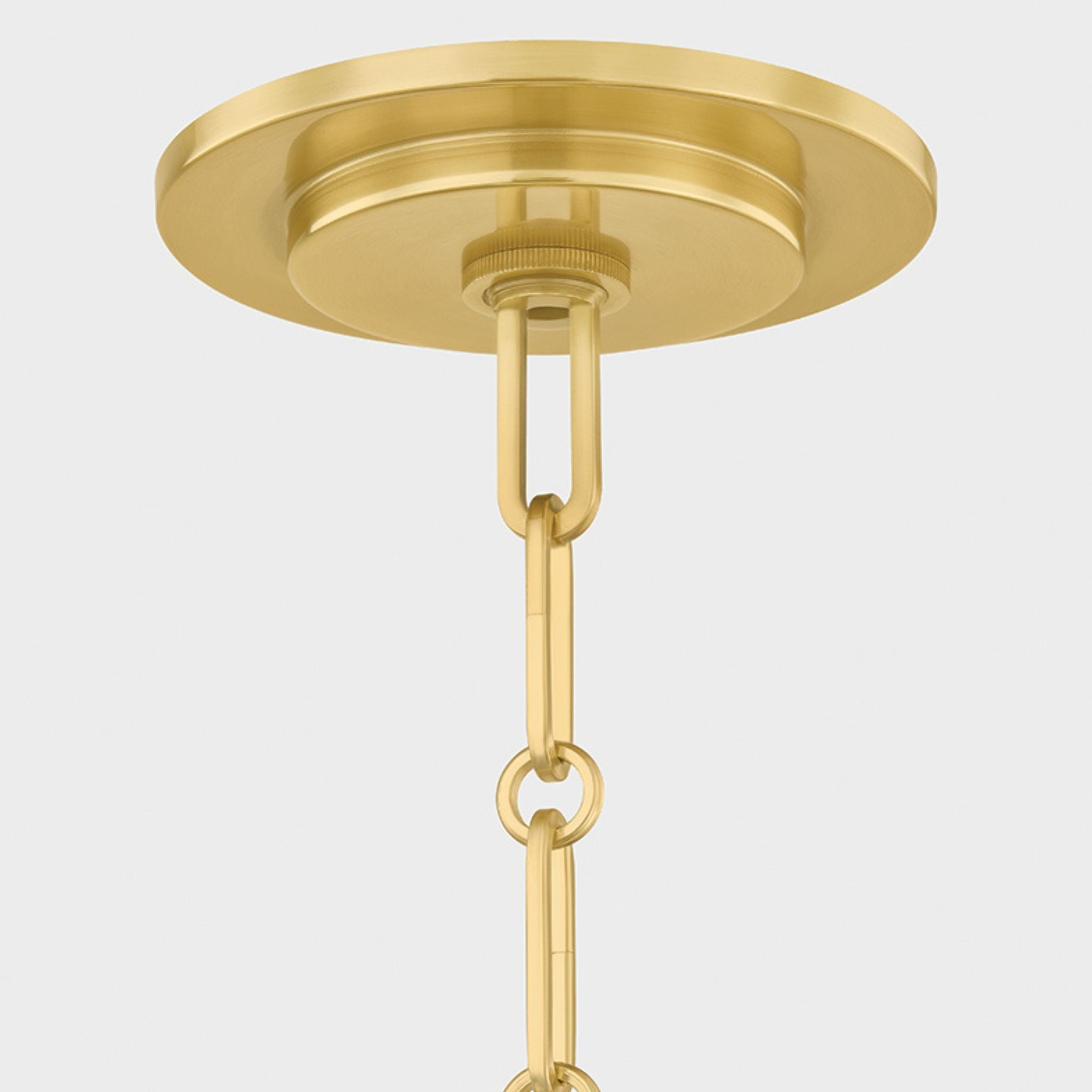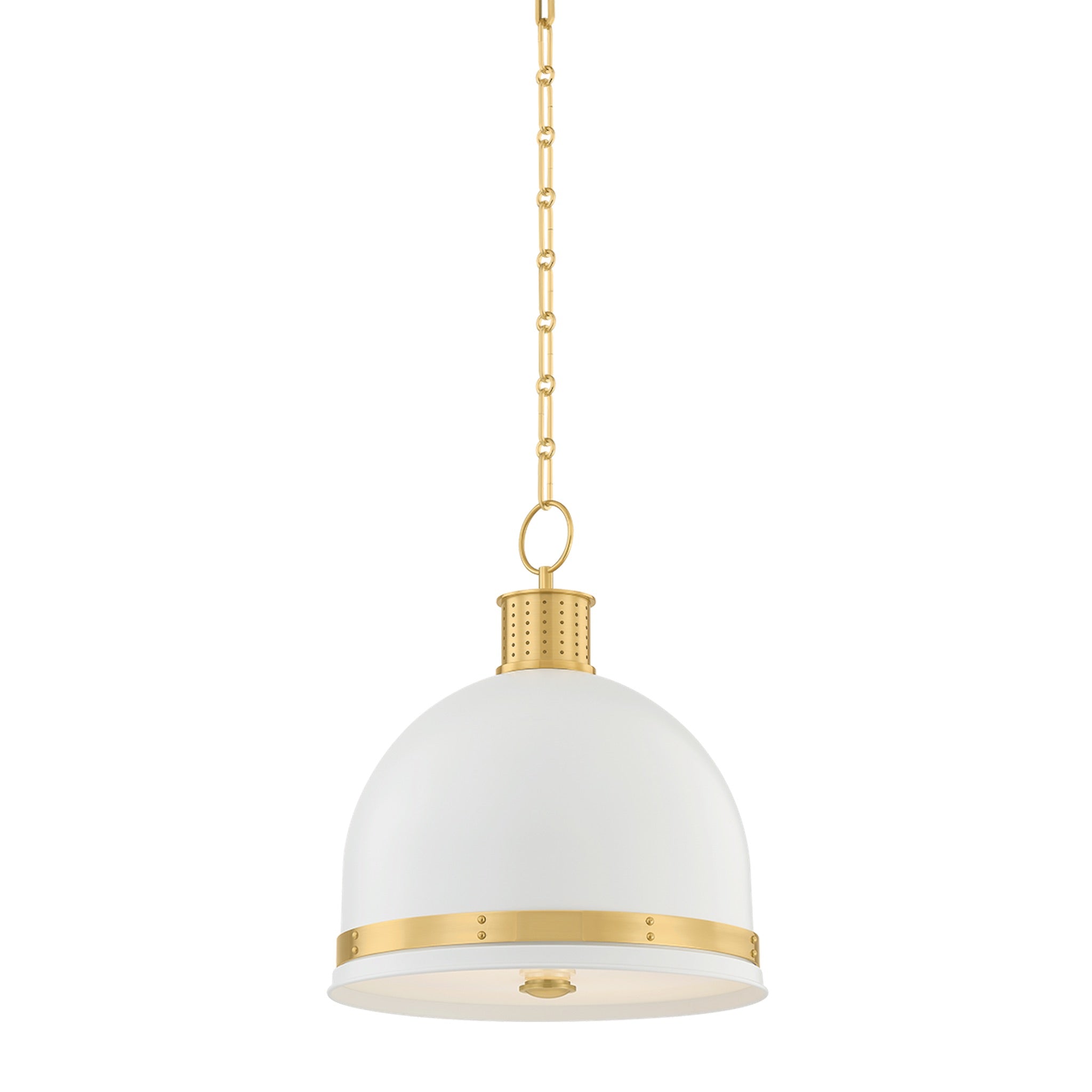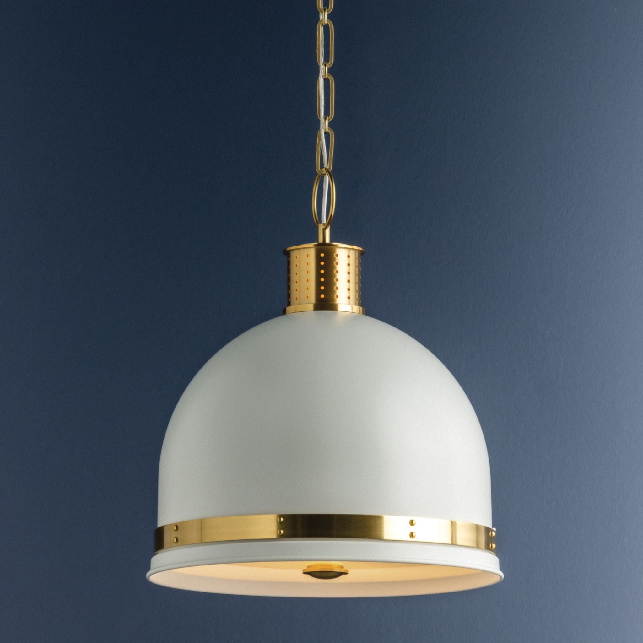 The Briscoe Pendant modernizes the classic RLM silhouette with matte Soft White paint, a white glass diffuser, and bold perforated and studded details. Suspended from an aged brass chain and hardware, it brings bright, versatile style to kitchens, dining areas, or entryways.