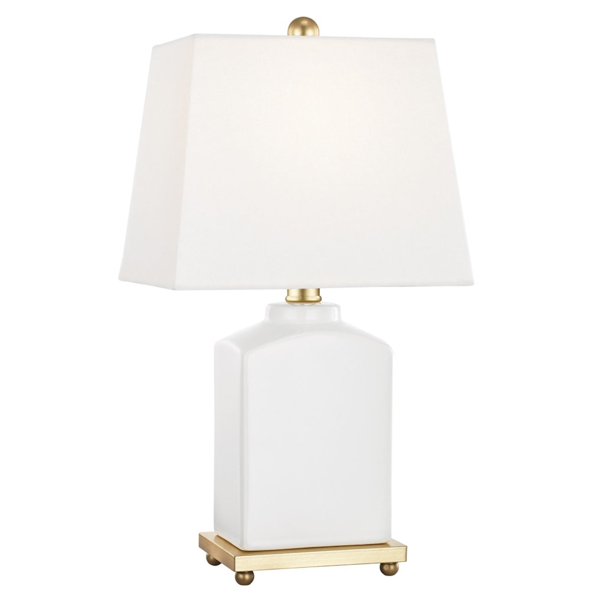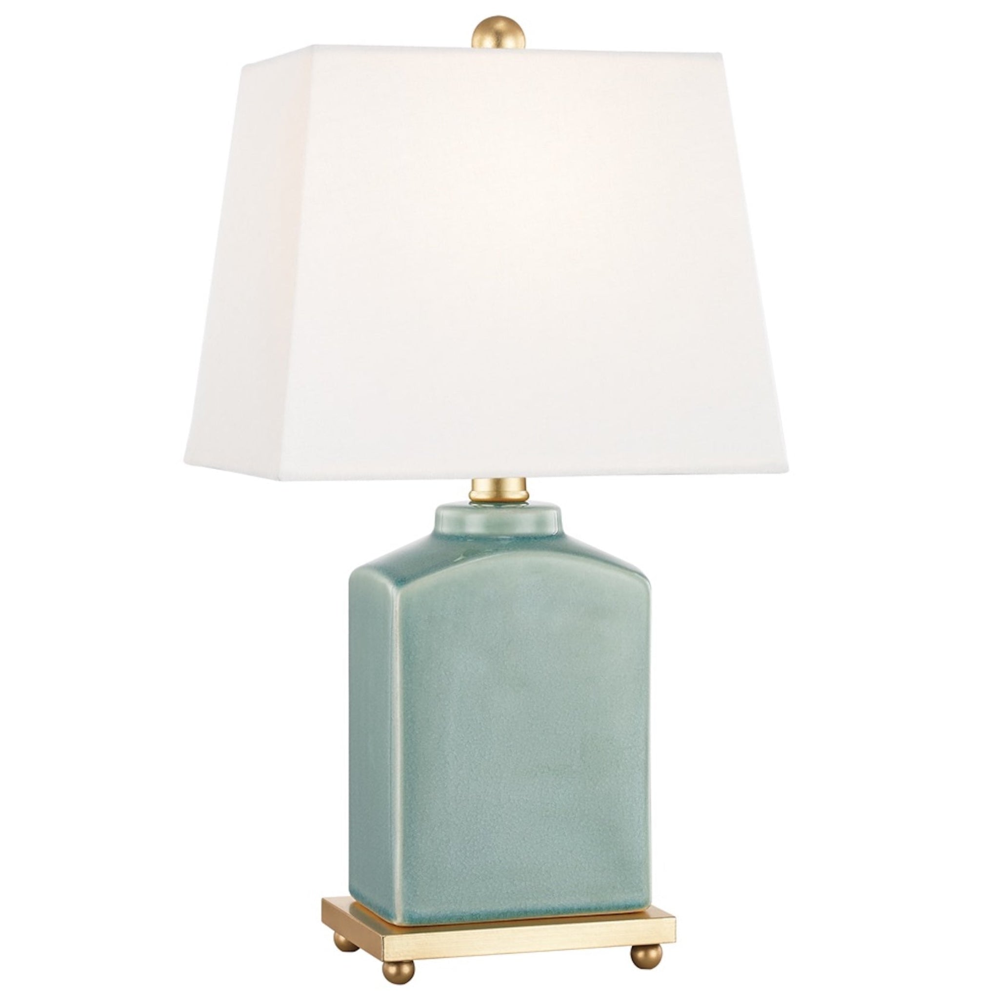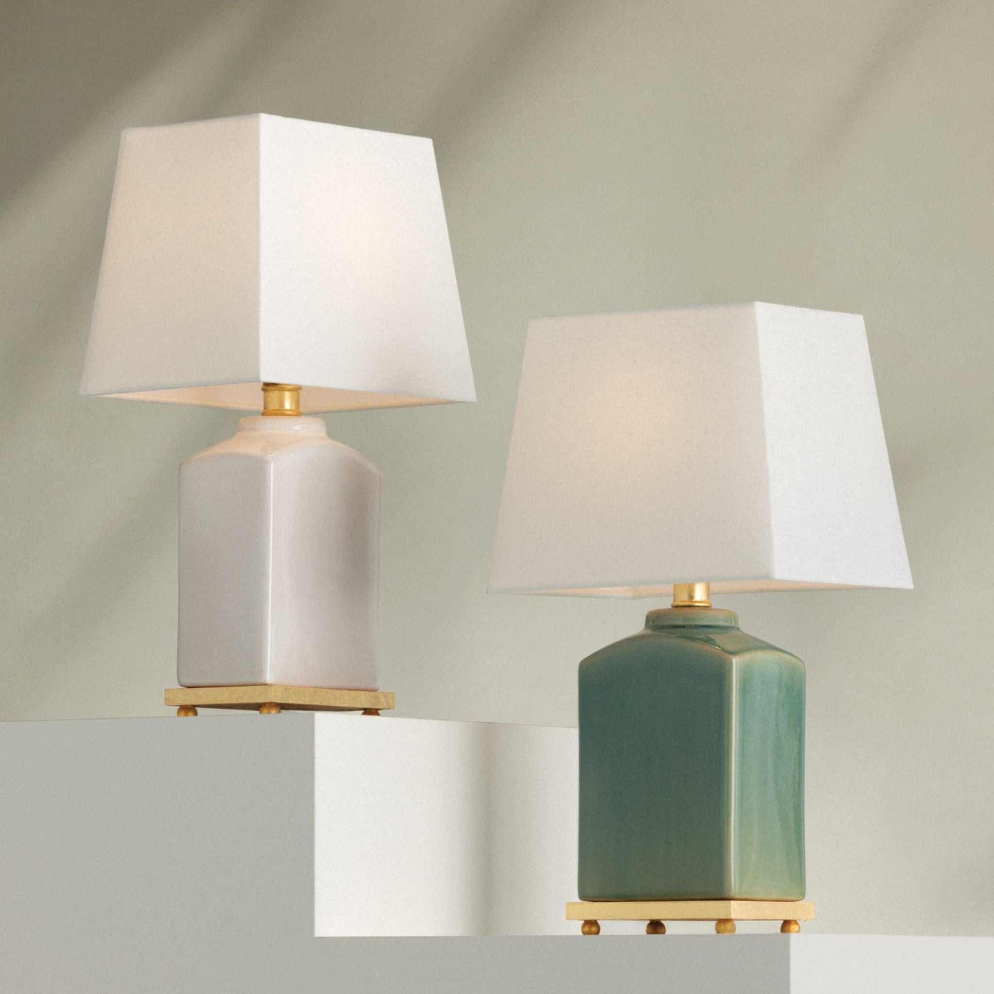 The Brynn Table Lamp pairs a sleek jade ceramic base with a soft linen shade for a refined blend of classic and contemporary style. Its compact silhouette and warm glow make it an elegant accent for desks, nightstands, or living spaces.