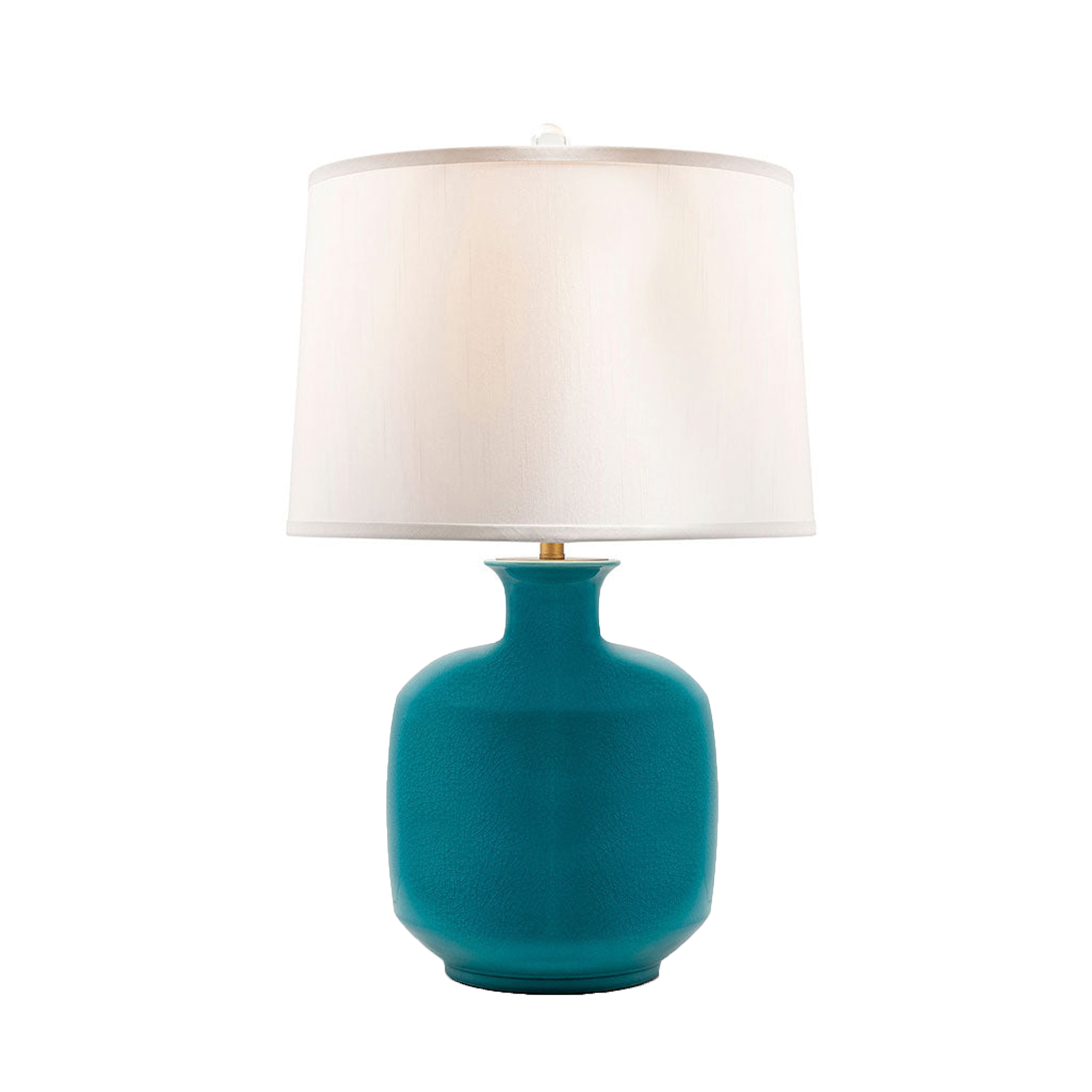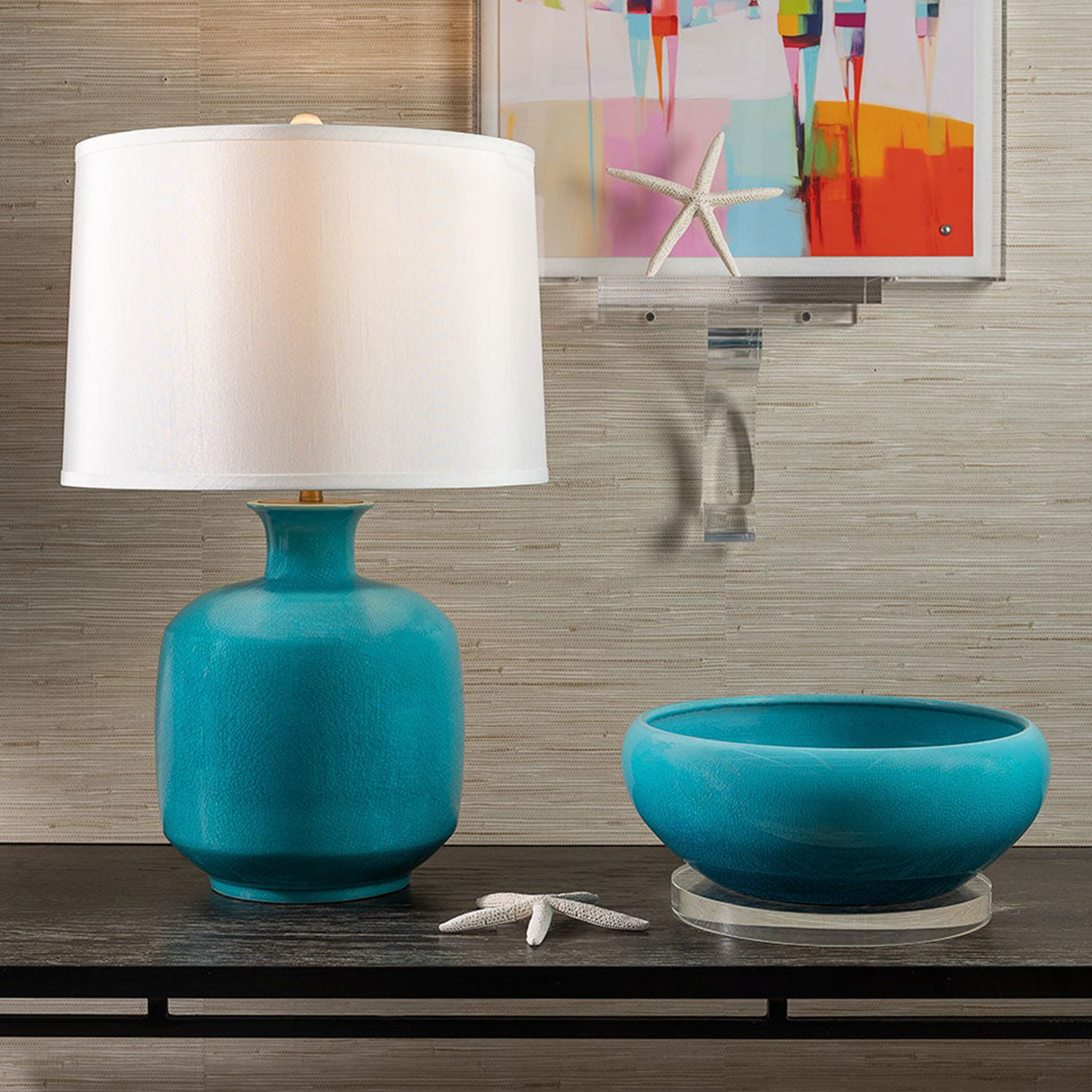 The Lakewood Lamp features a transitional silhouette that blends classic design with modern elegance. Crafted from porcelain with a crackled turquoise glaze, it has a colorful patina and range of turquoise color. Accented with aged brass finished metal.